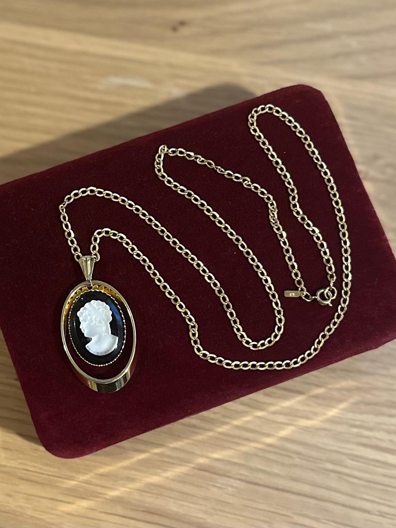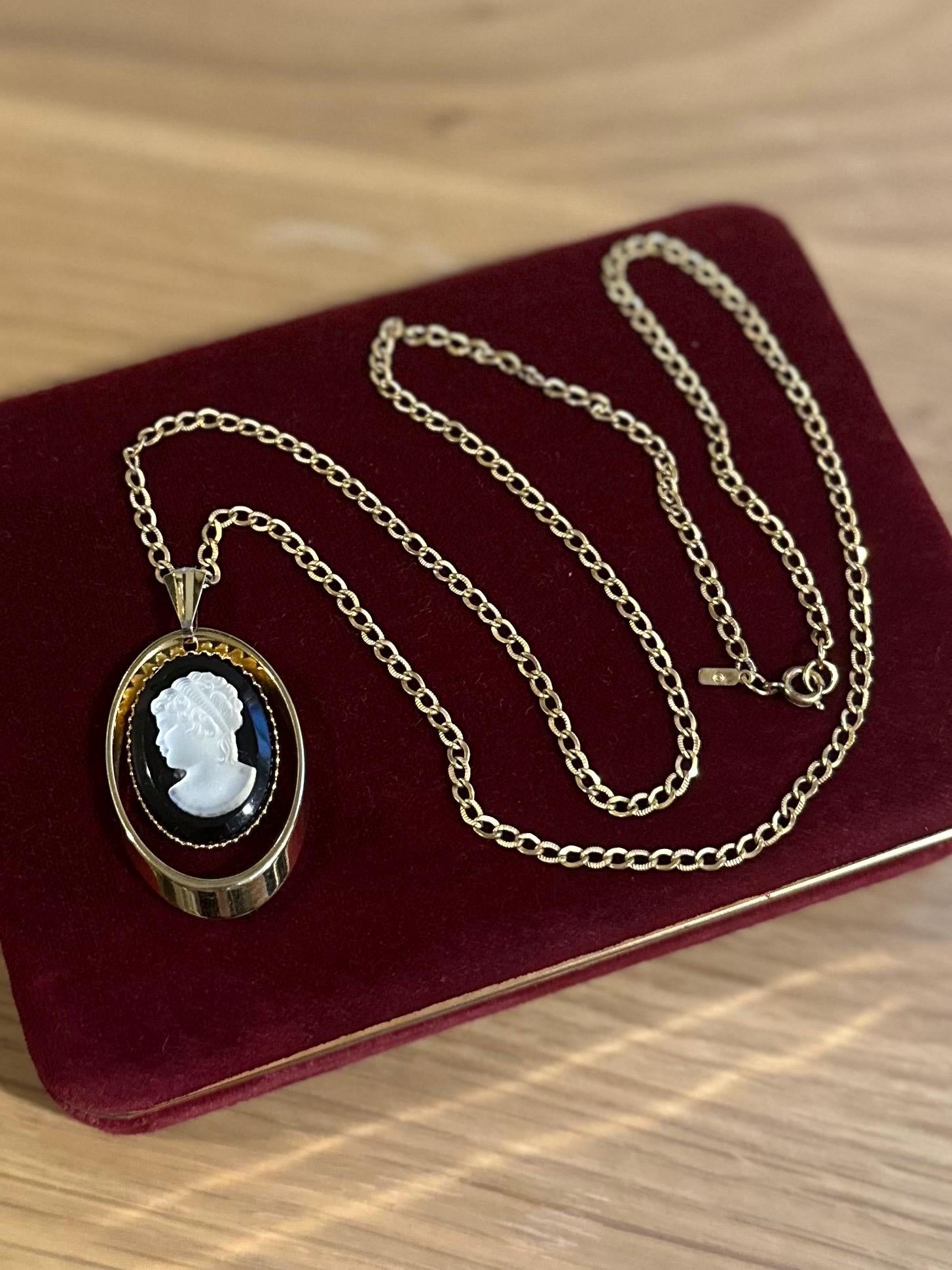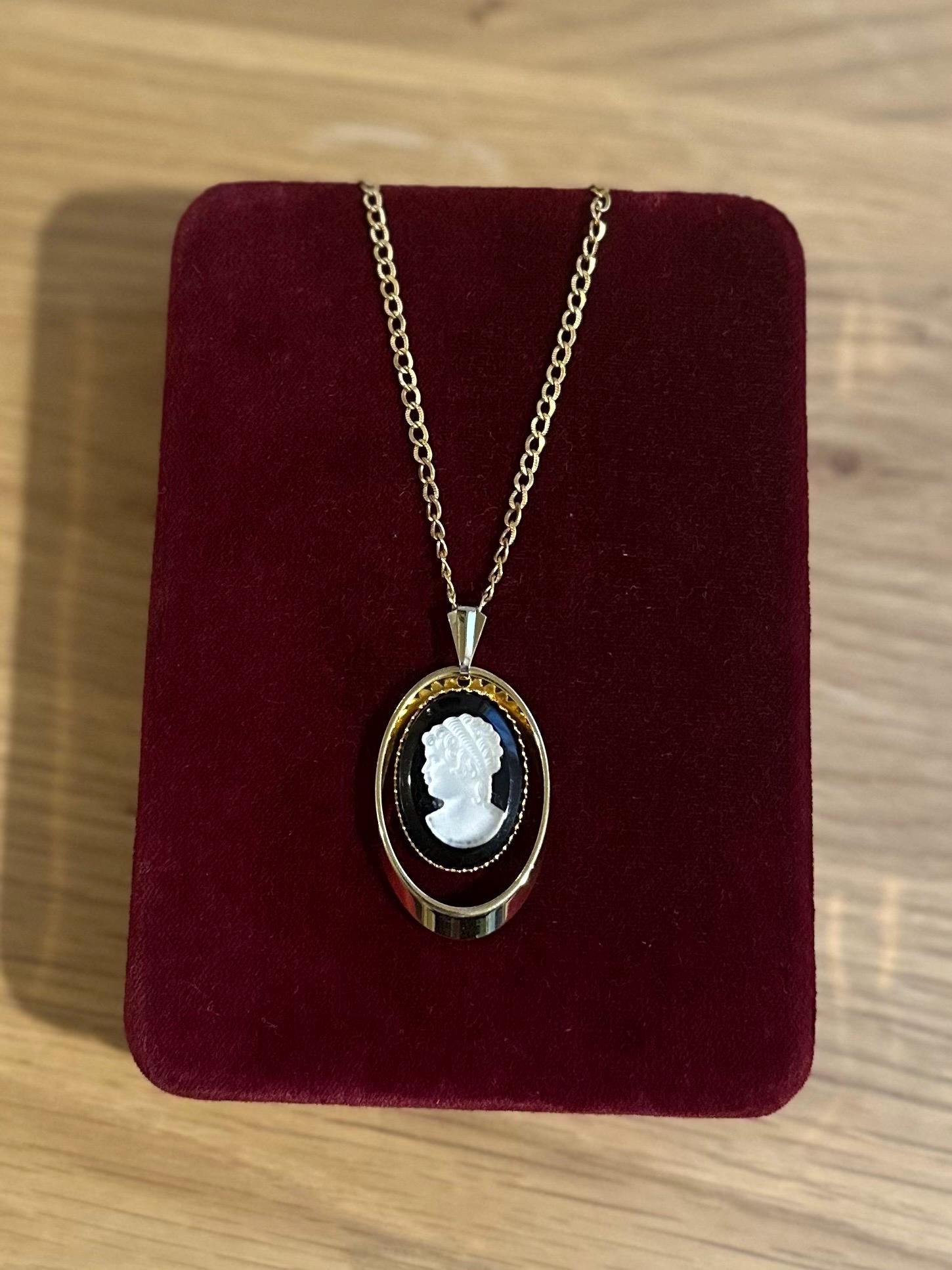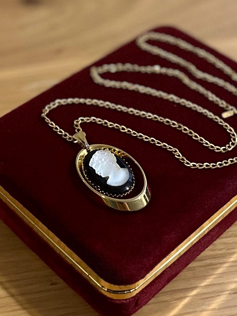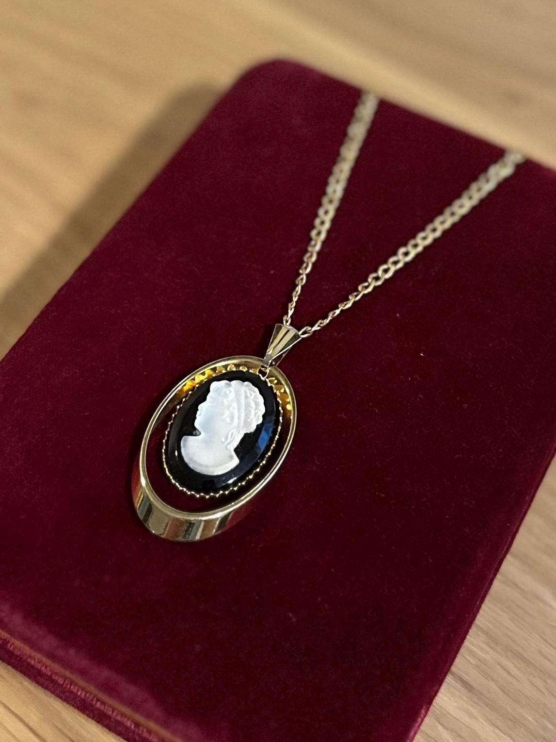 Vintage Gold Tone Black & Translucent White Oval Cameo Pendant Necklace Long 23.75”