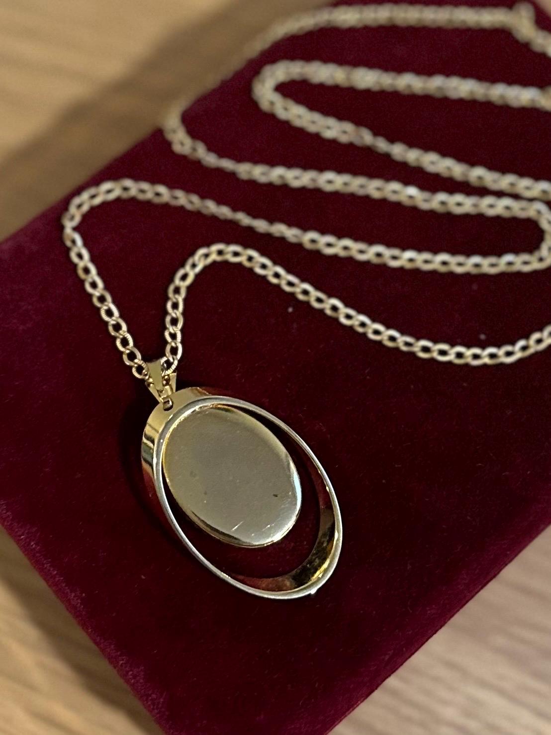 Chain measures approximately 23.75 inches long and has a spring ring clasp. Pendant measures approximately 1.9 inches long (including bail) by 1 inch wide.