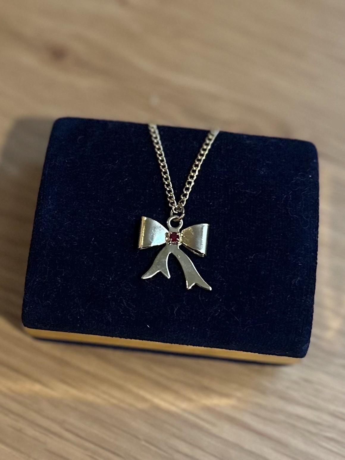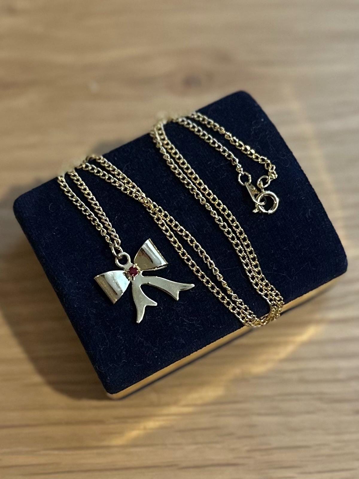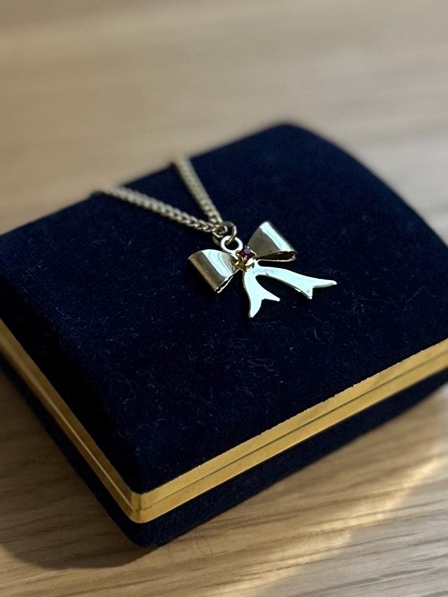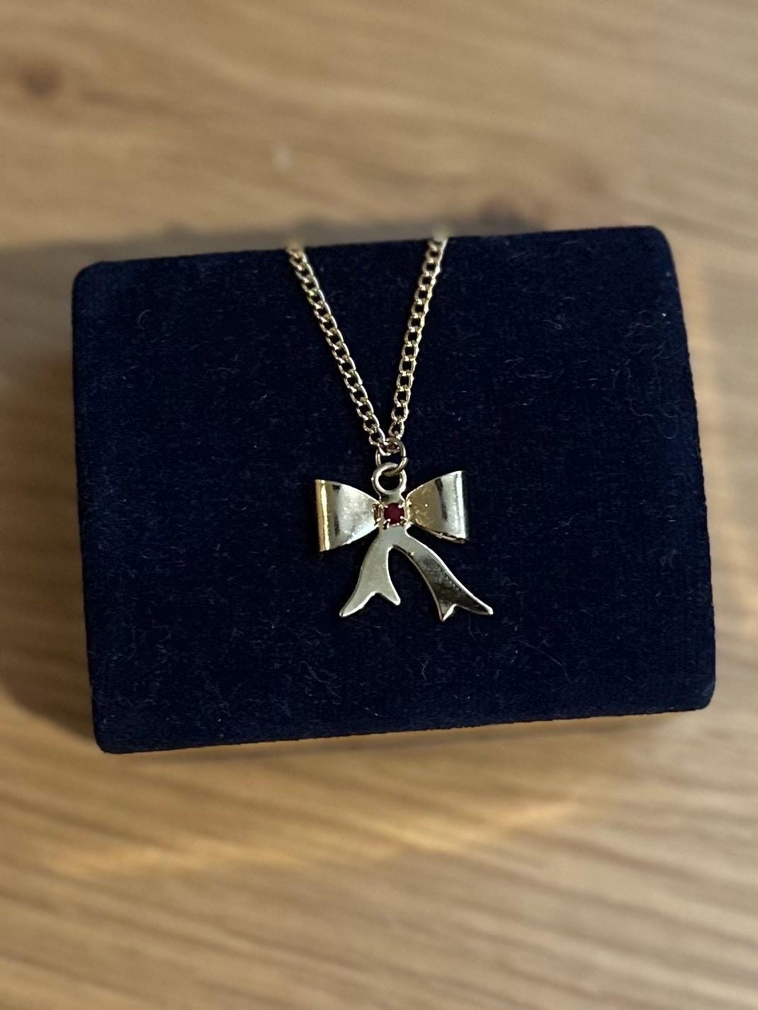 Vintage Gold Tone Bow Pendant Necklace Ruby Red Rhinestone