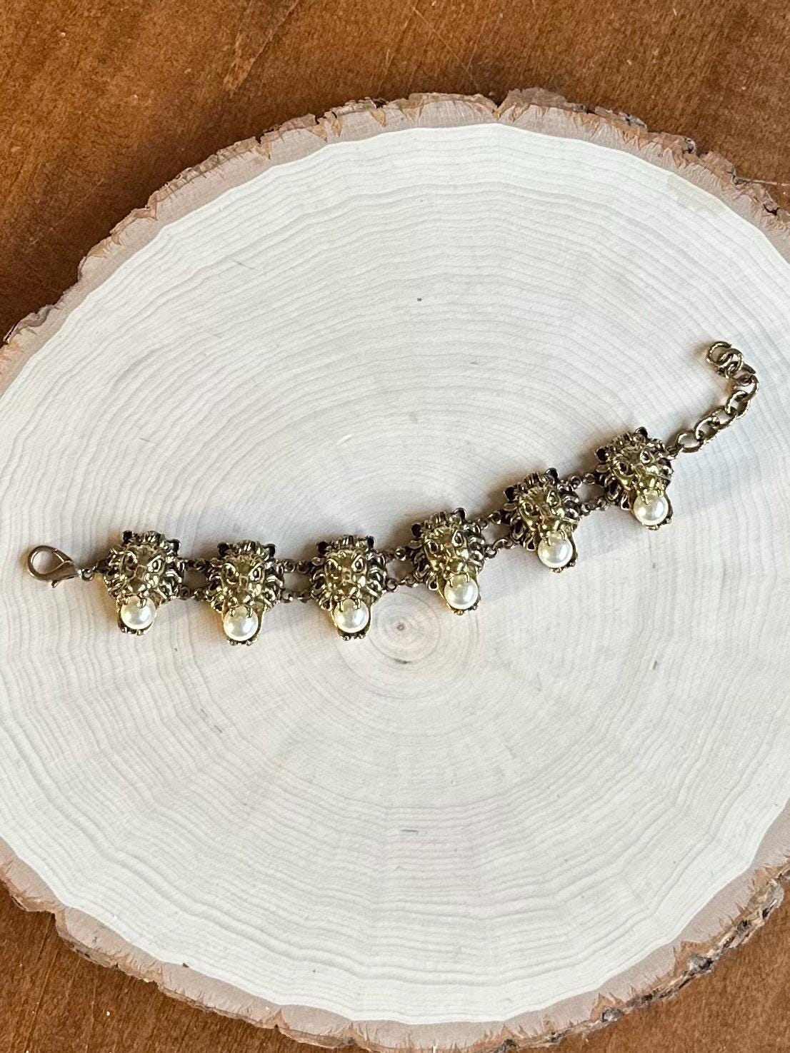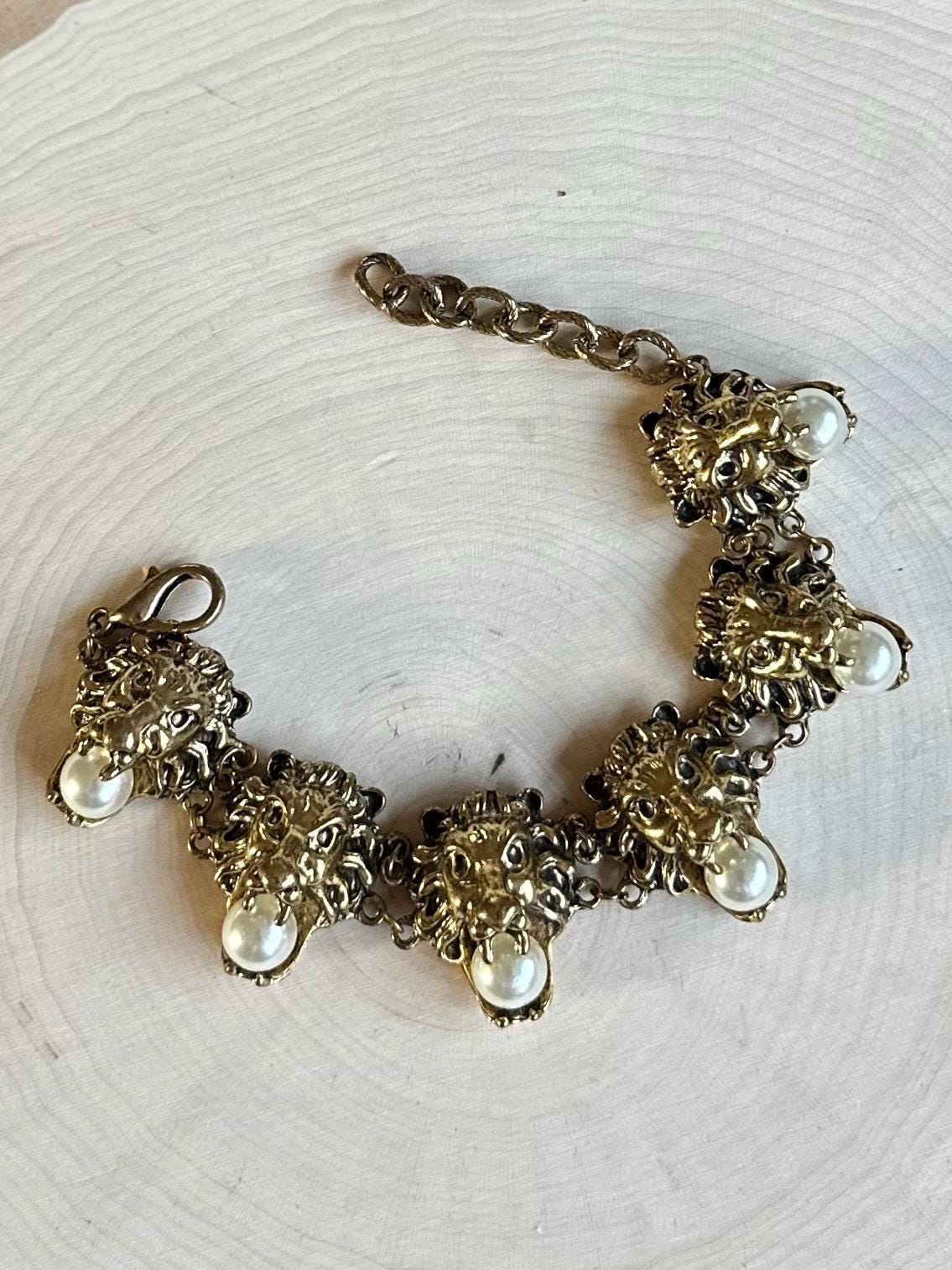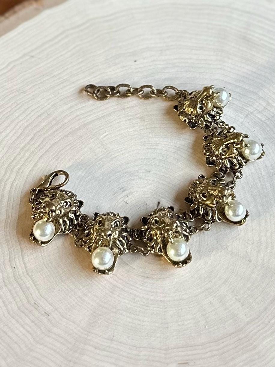 Rare Beautiful vintage gold tone bracelet adorned with faux pearls. Features 6 lion head links, each holding a pearl in their mouth. Such a unique statement piece! Hard to find & unsigned.