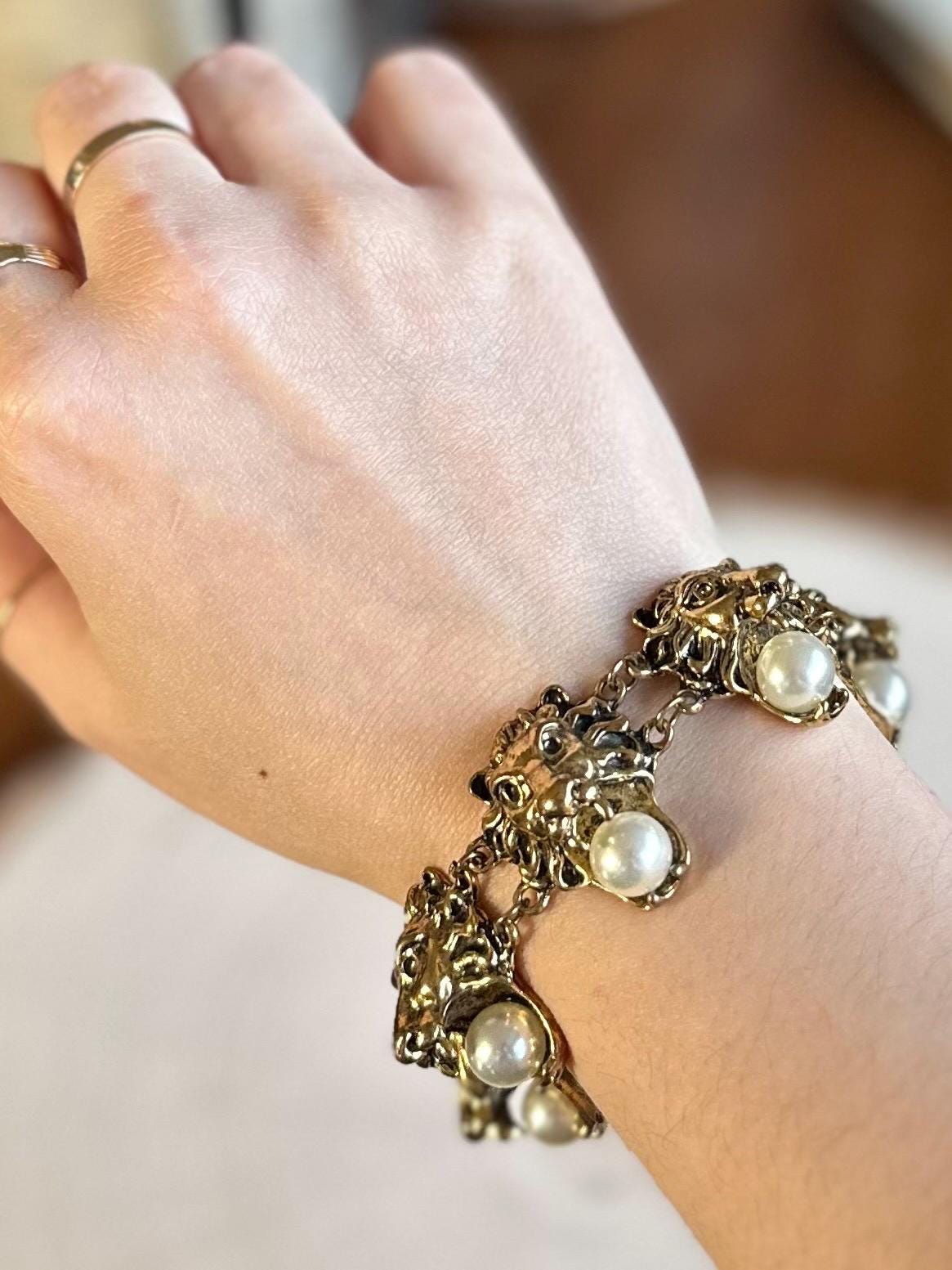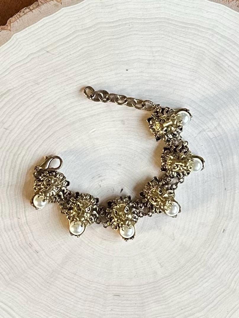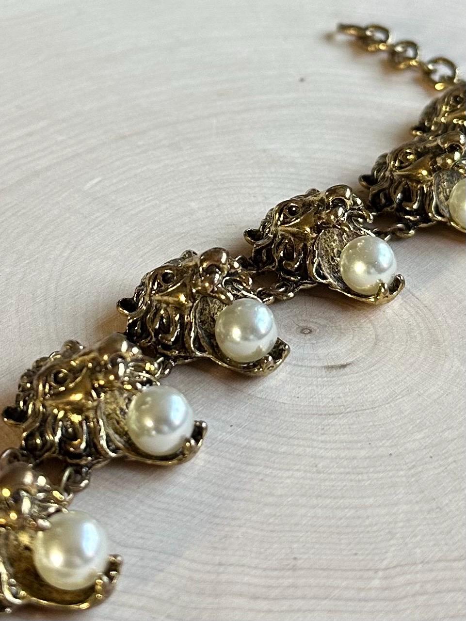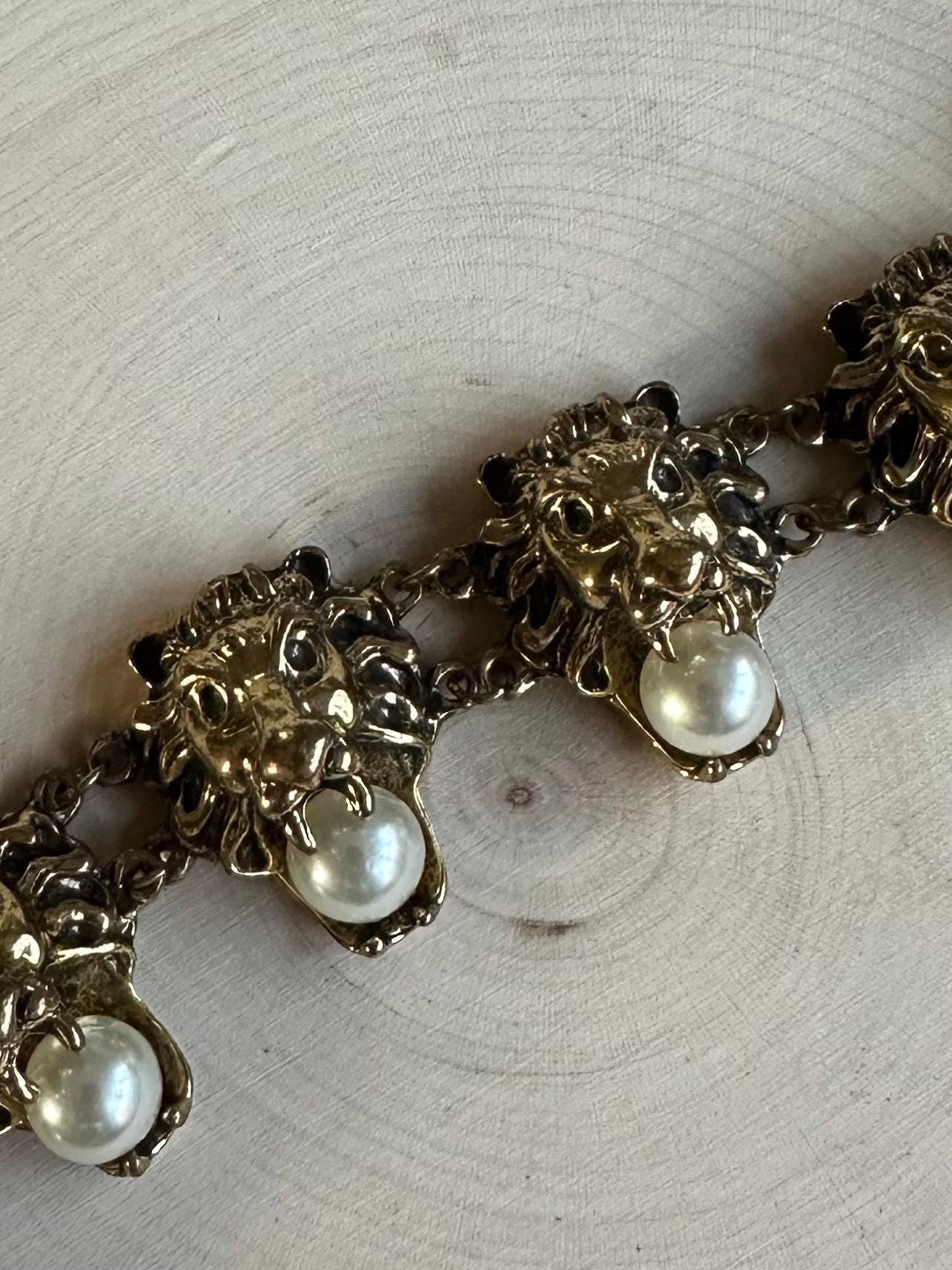 Rare Beautiful vintage gold tone bracelet adorned with faux pearls. Features 6 lion head links, each holding a pearl in their mouth. Such a unique statement piece! Hard to find & unsigned.