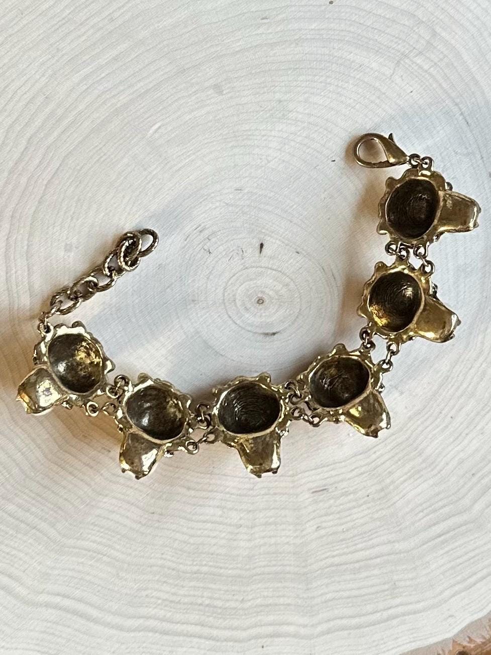 Bracelet measures approximately 8.5 inches long, and is adjustable with a lobster claw clasp. Bracelet can be adjusted down to 7 inches long. Width of bracelet is approximately 1 inch.