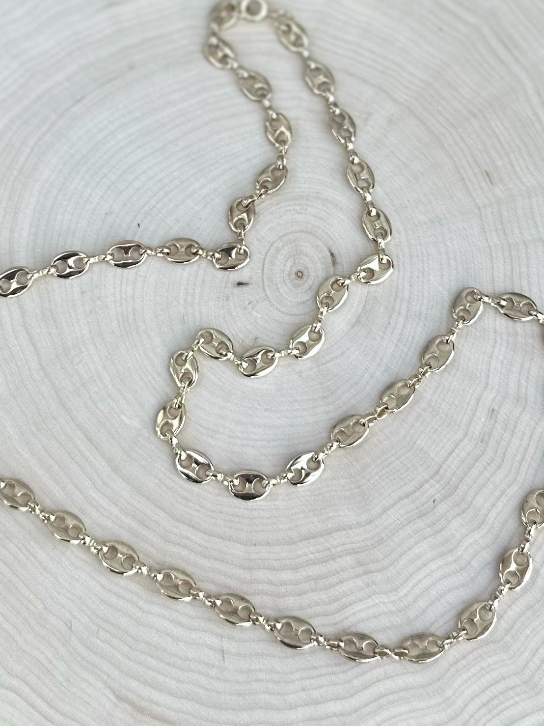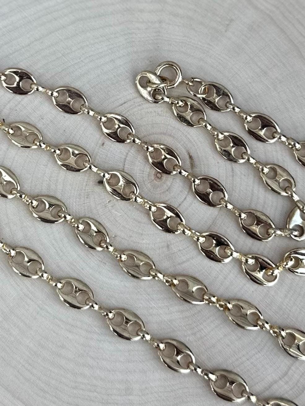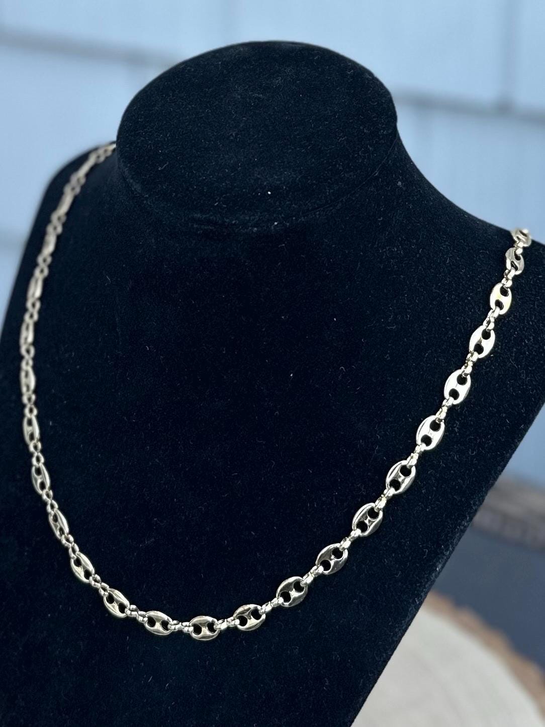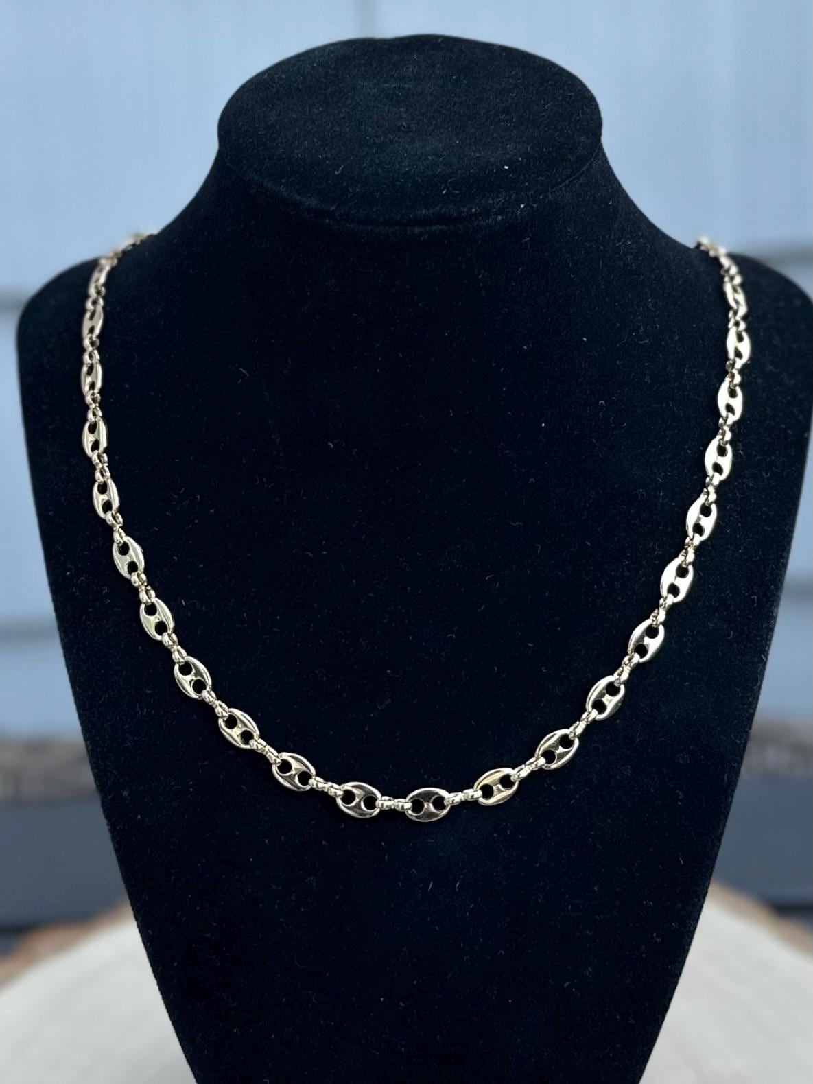 Chain measures approximately 26.25 inches long by 0.25 inch wide, and has a spring ring clasp.