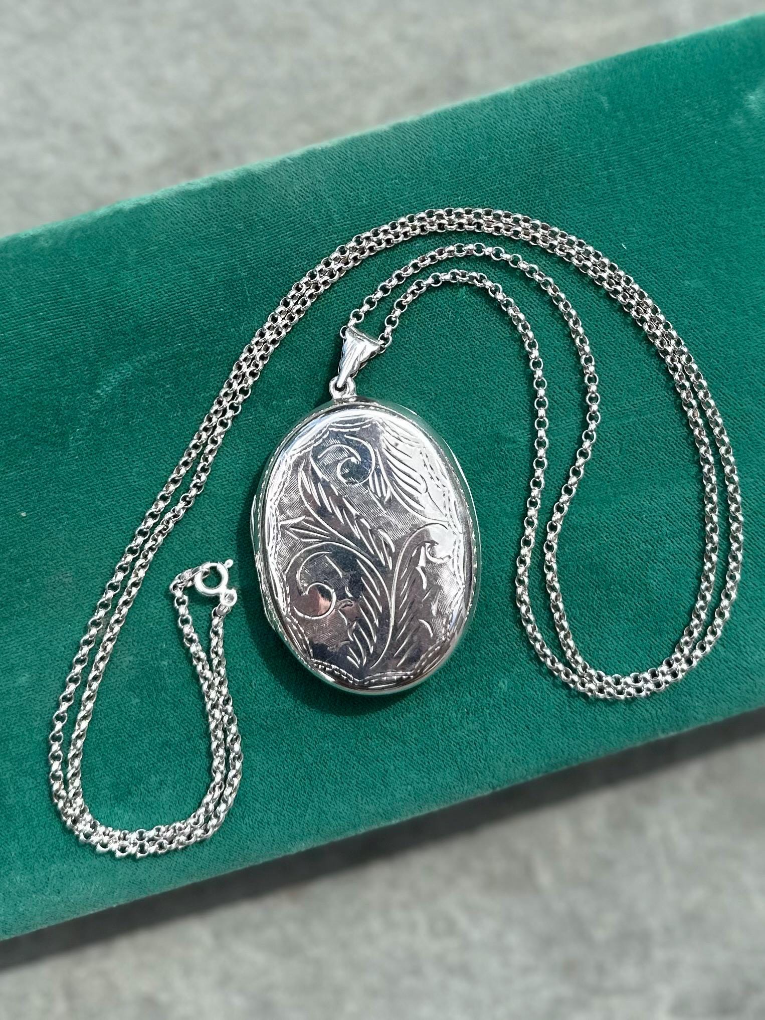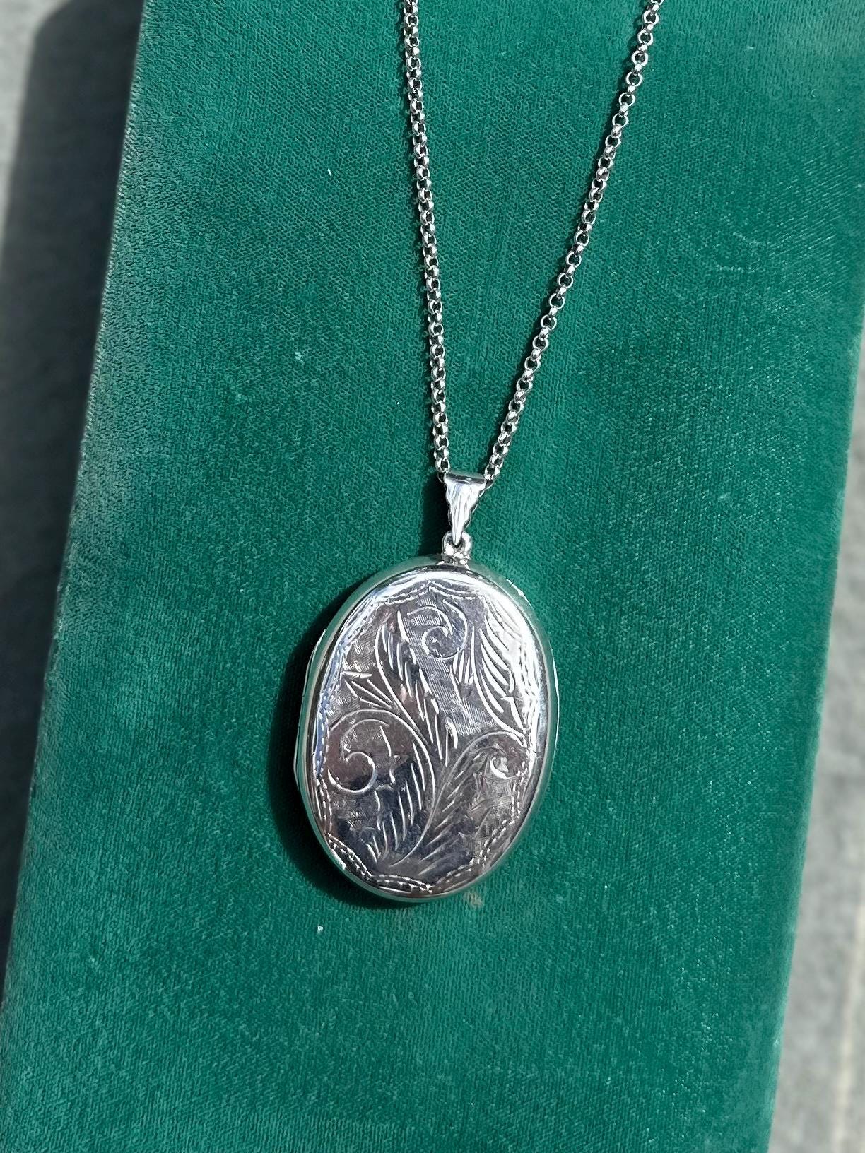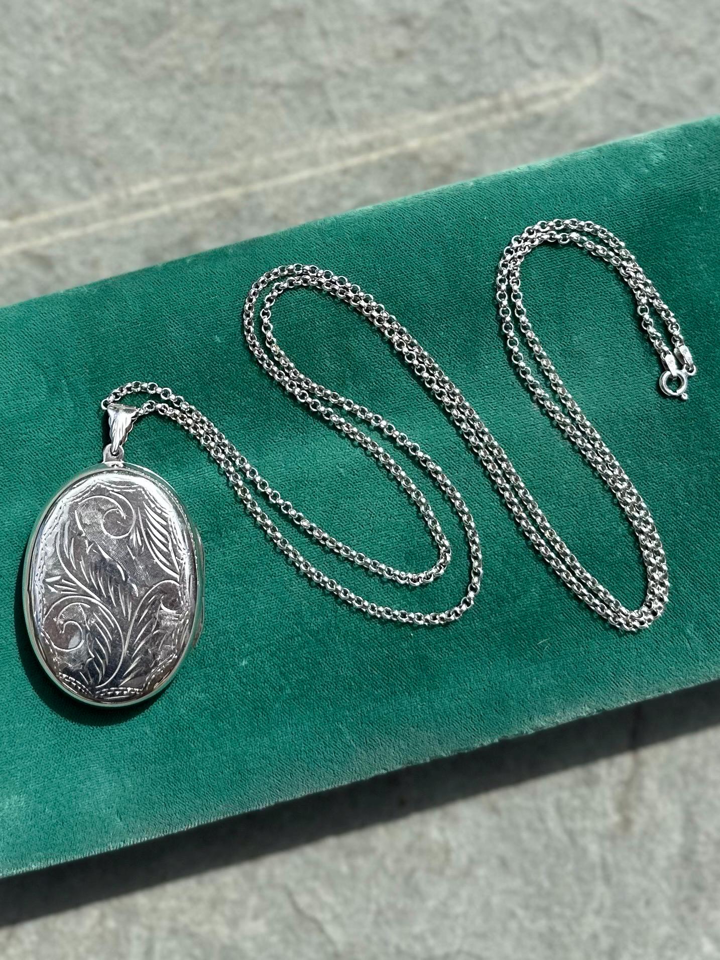 Beautiful hand engraved sterling silver oval locket on a rolo chain. Locket will hold two photos.