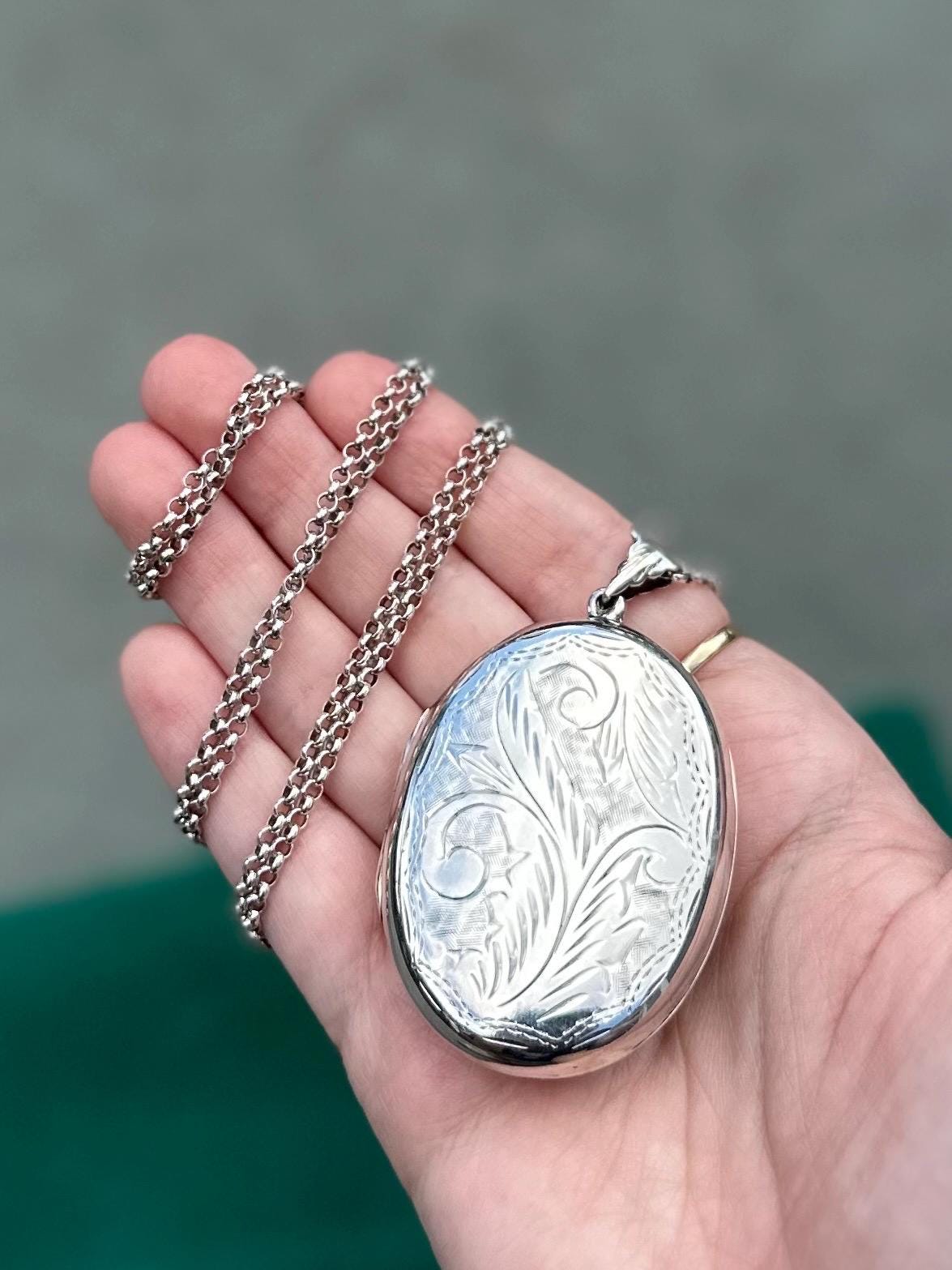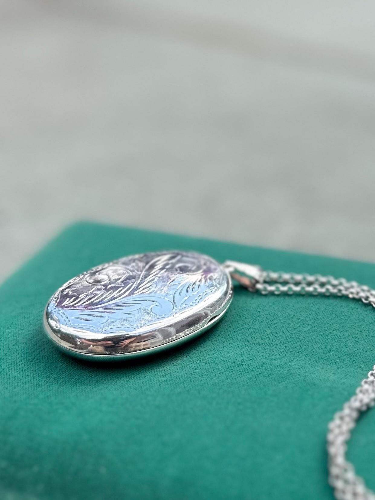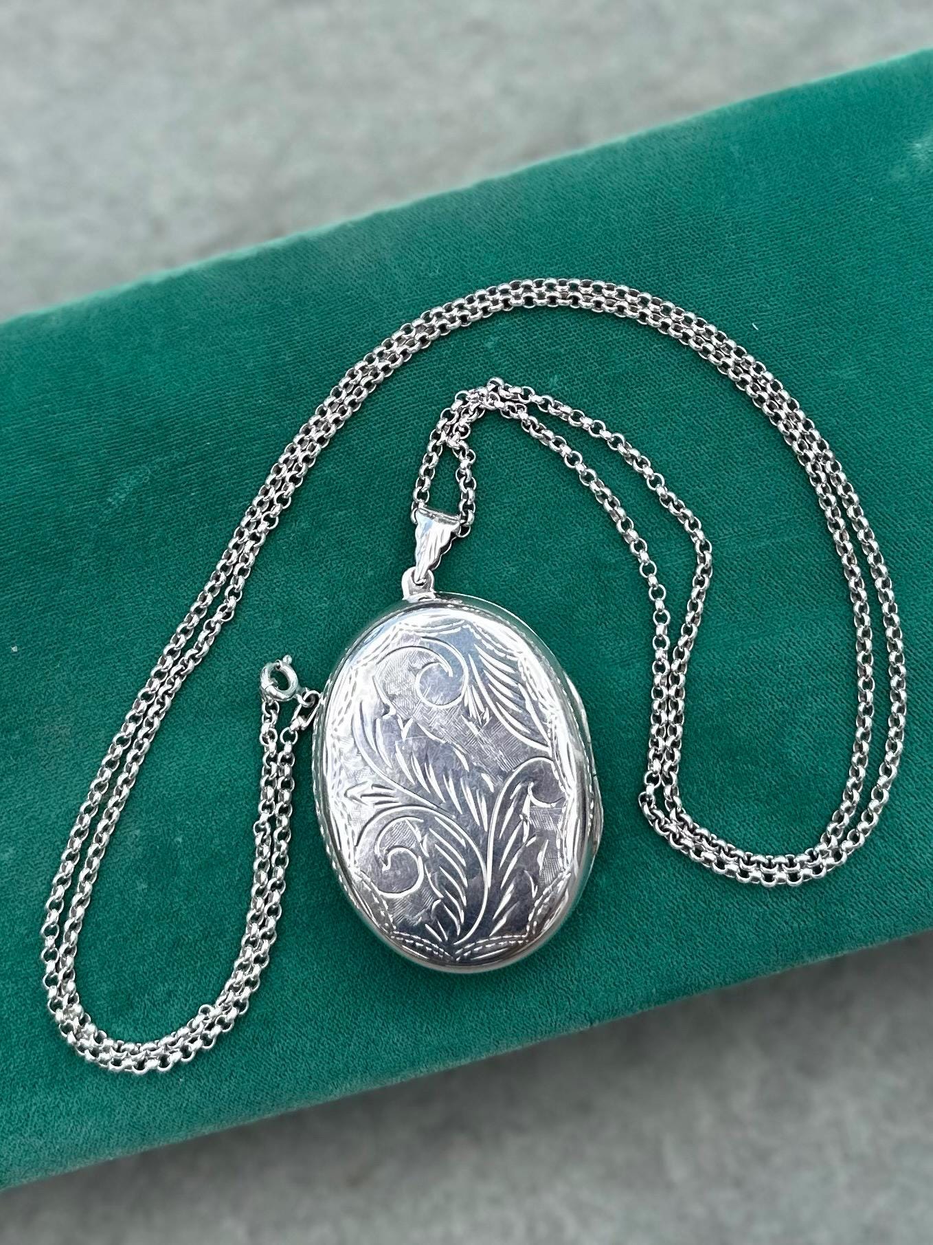 Beautiful hand engraved sterling silver oval locket on a rolo chain. Locket will hold two photos.