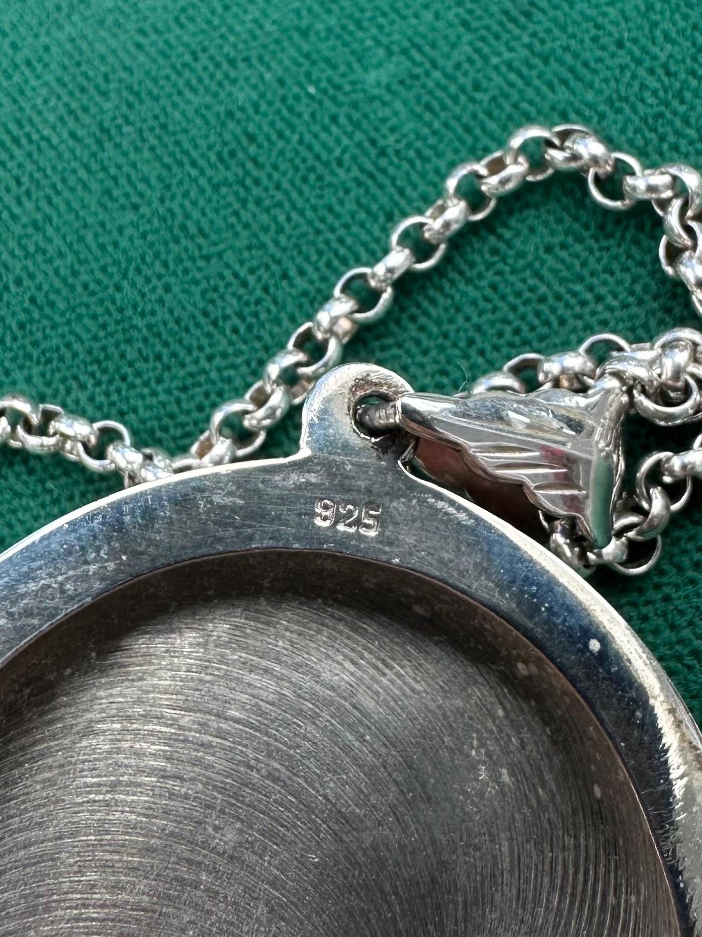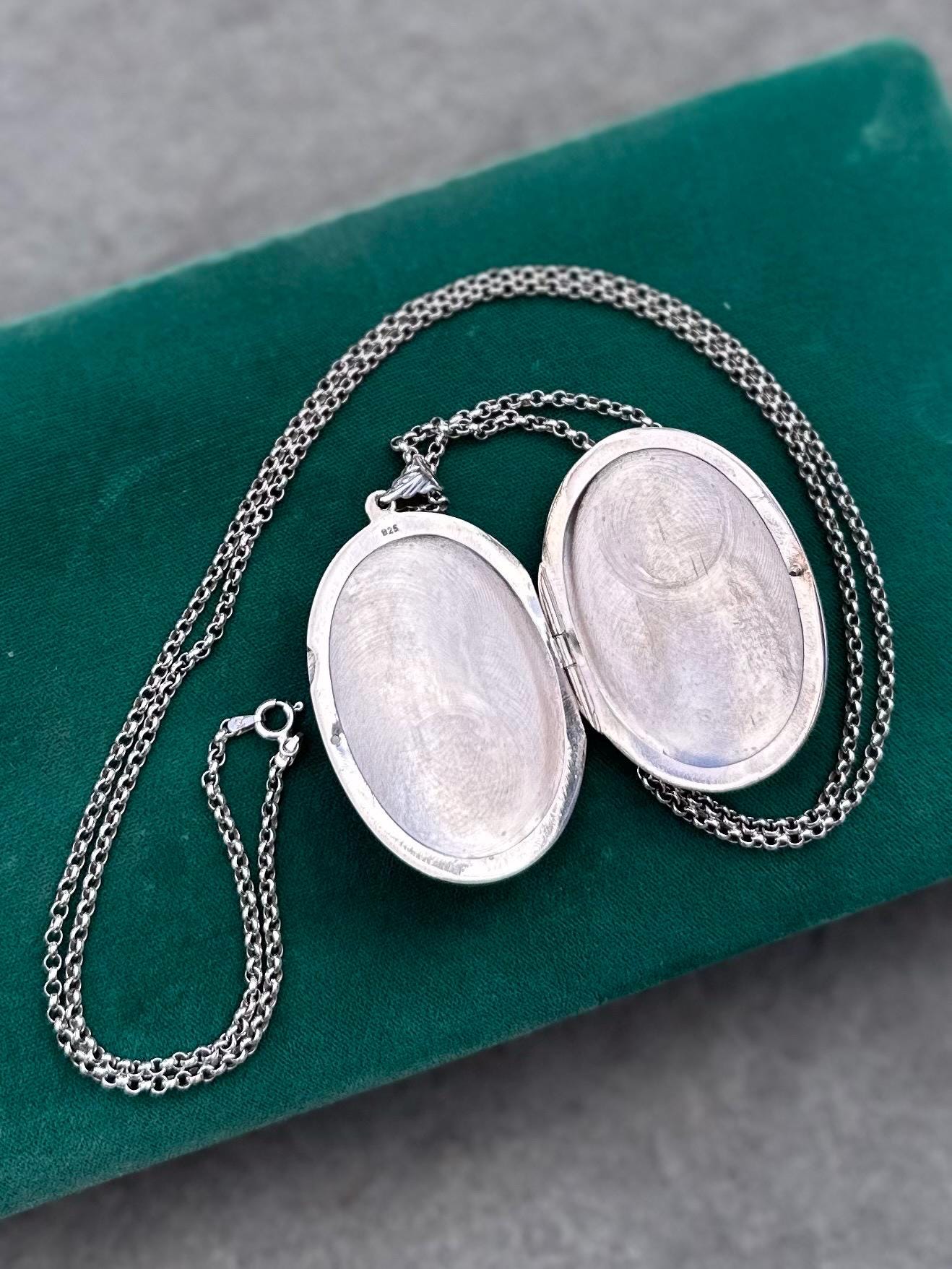 Locket measures approximately 2.5 inches long (including bail) by 1.5 inches wide. Inside of locket is stamped "925".
