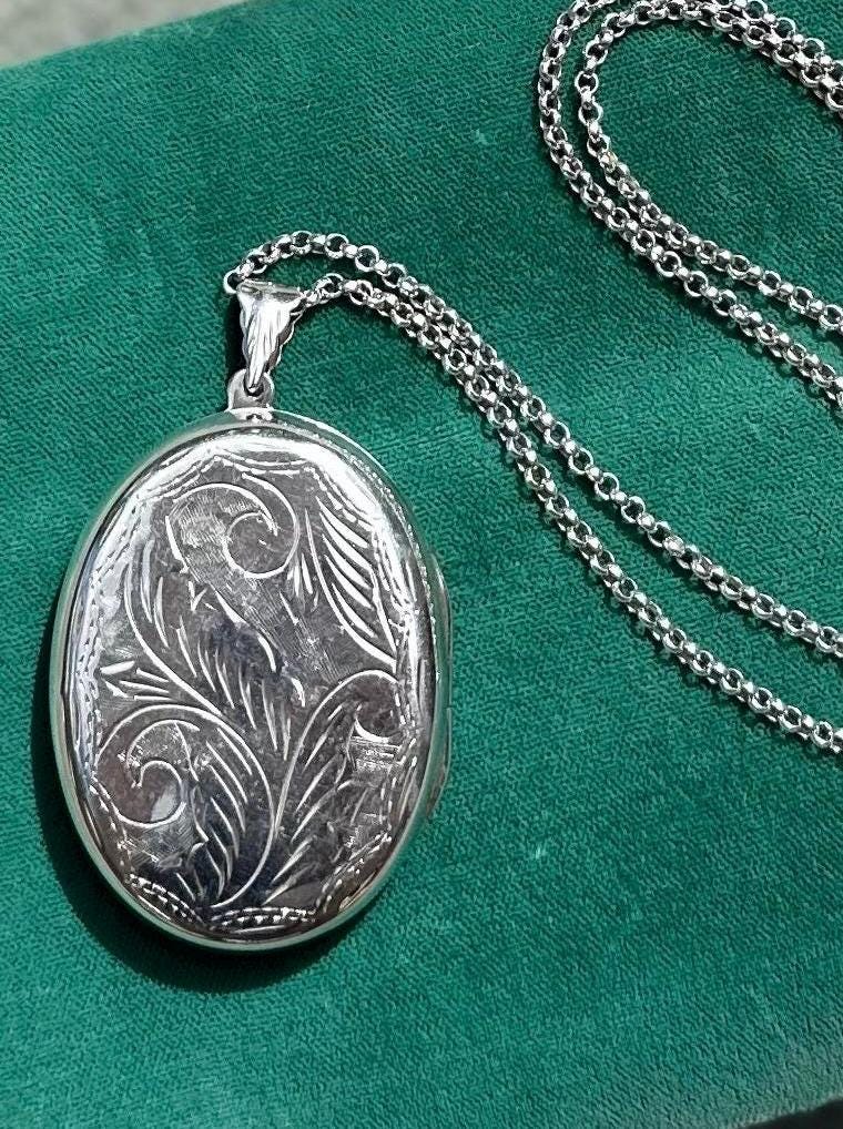 Vintage Hand Engraved Sterling Silver Large Oval Locket Pendant Necklace