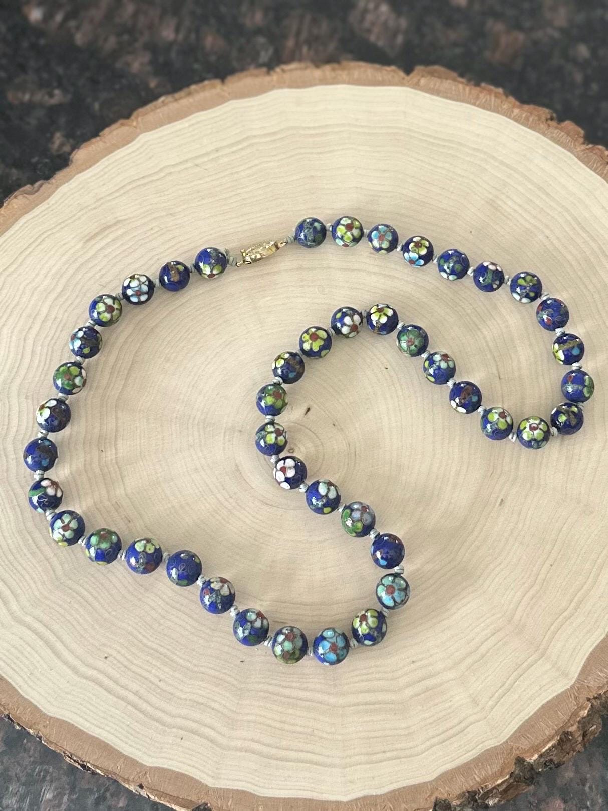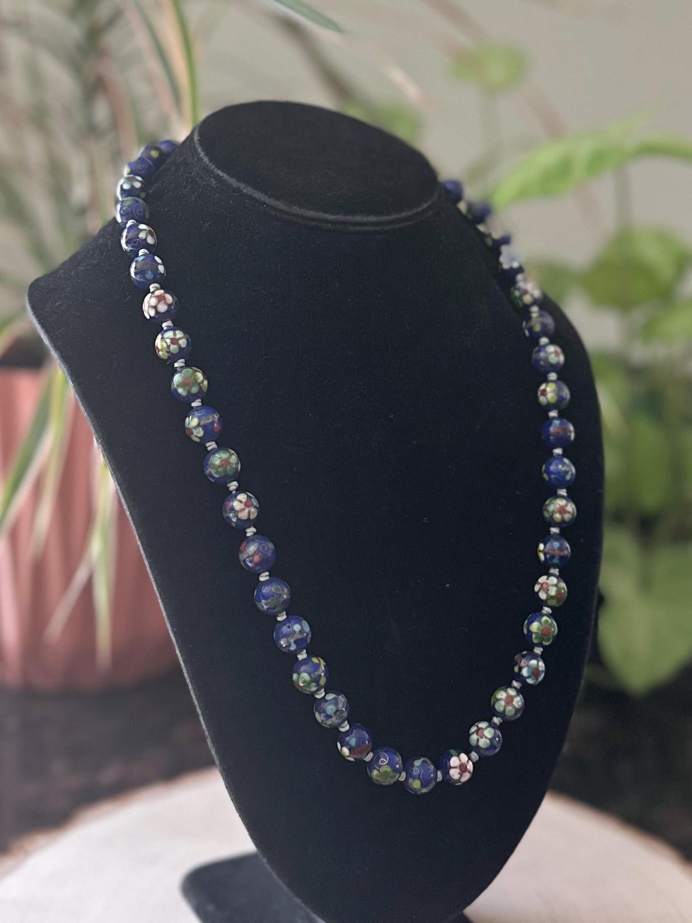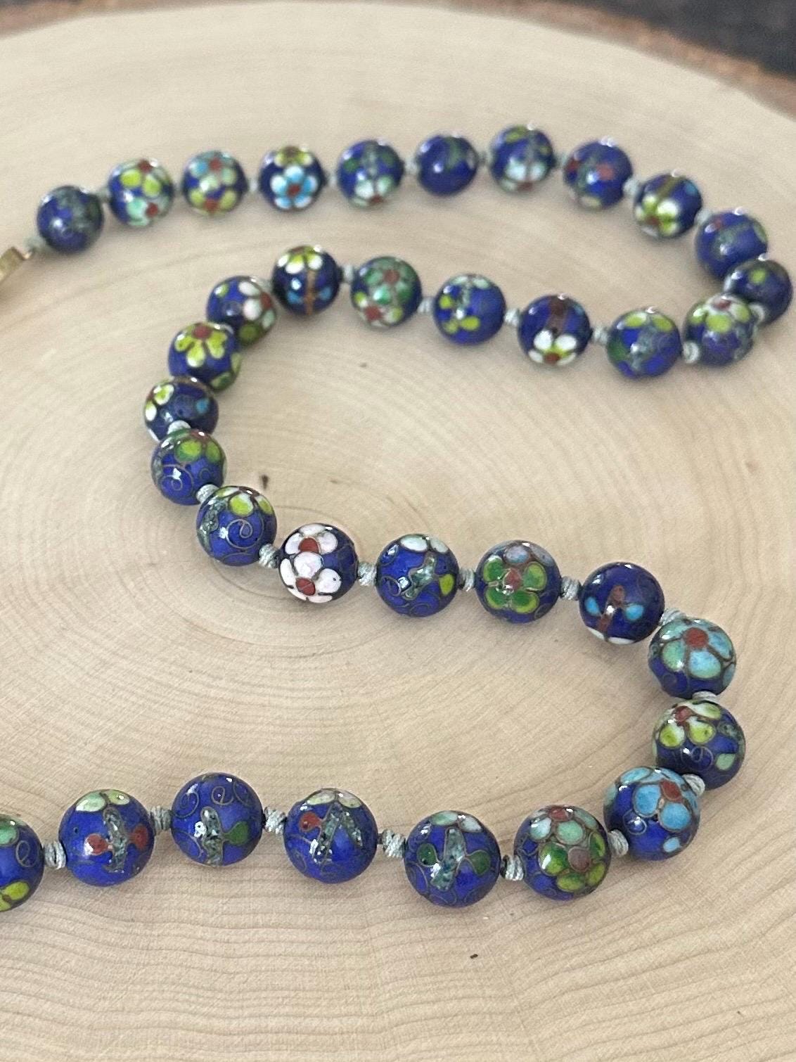Vintage Midcentury Hand Knotted Blue Cloisonné Enamel Blue Floral Porcelain Beaded Necklace 23”