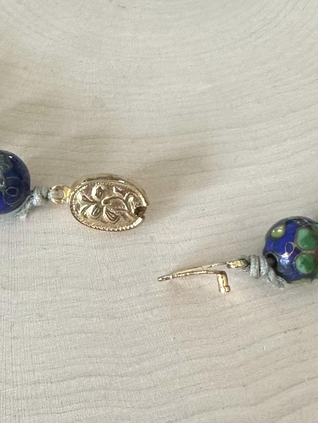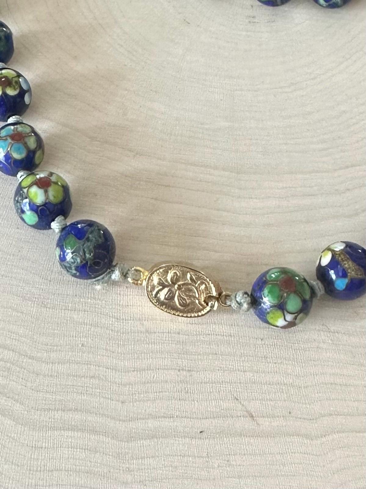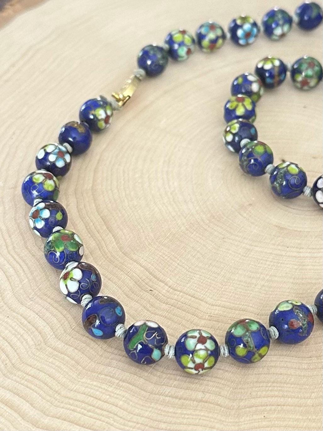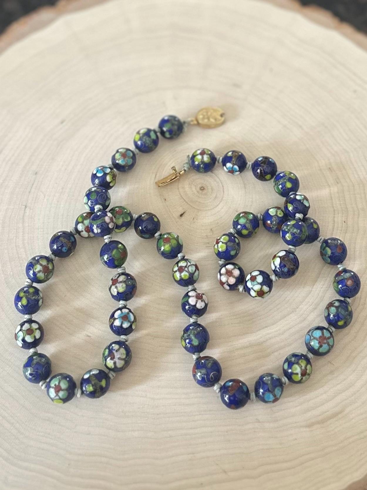 Vintage Midcentury Hand Knotted Blue Cloisonné Enamel Blue Floral Porcelain Beaded Necklace 23”