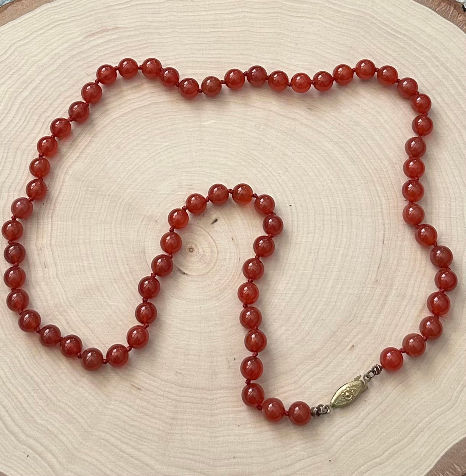 Vintage Midcentury Hand Knotted Genuine Carnelian Beaded Necklace Fish Hook 23.5