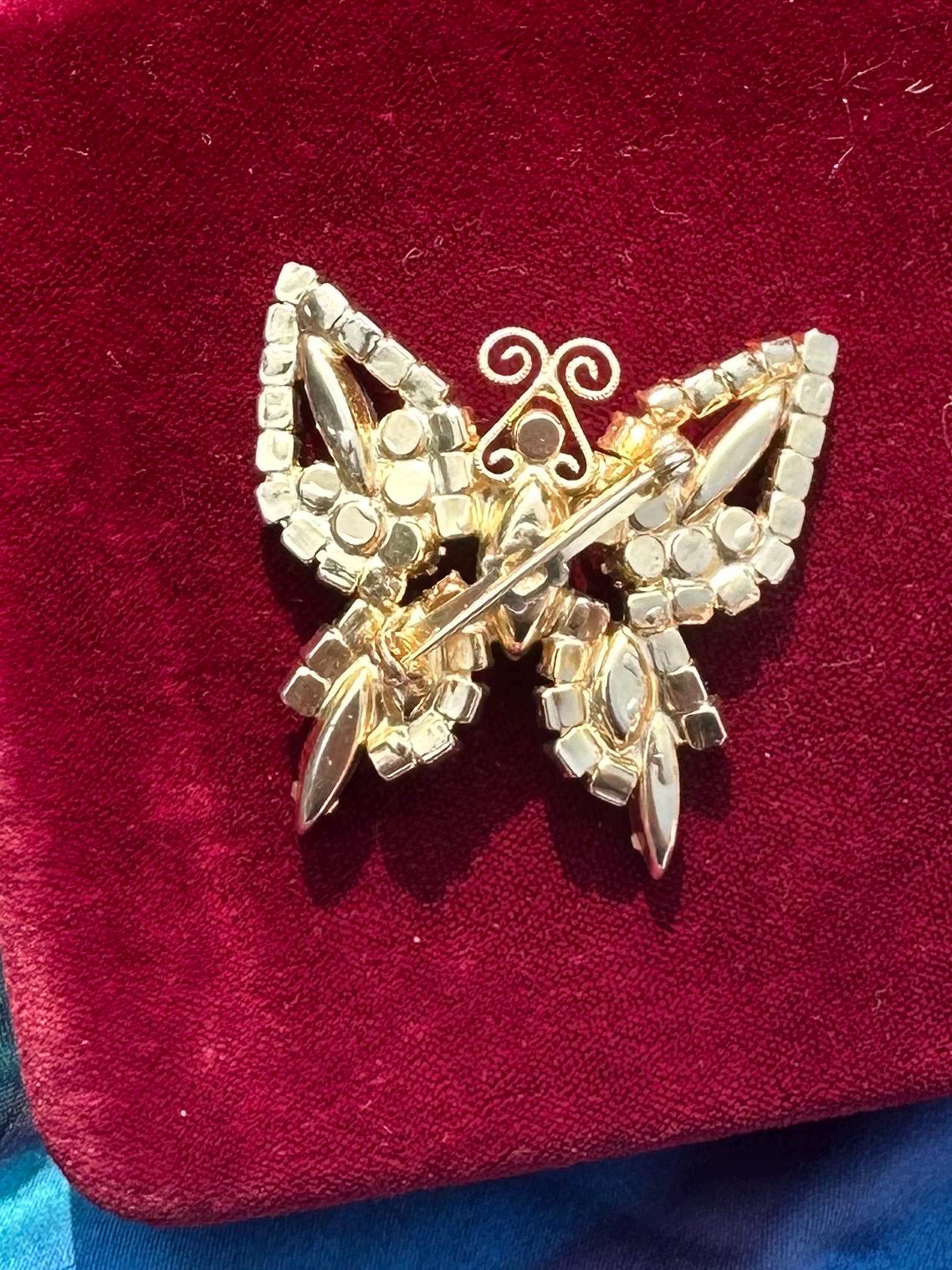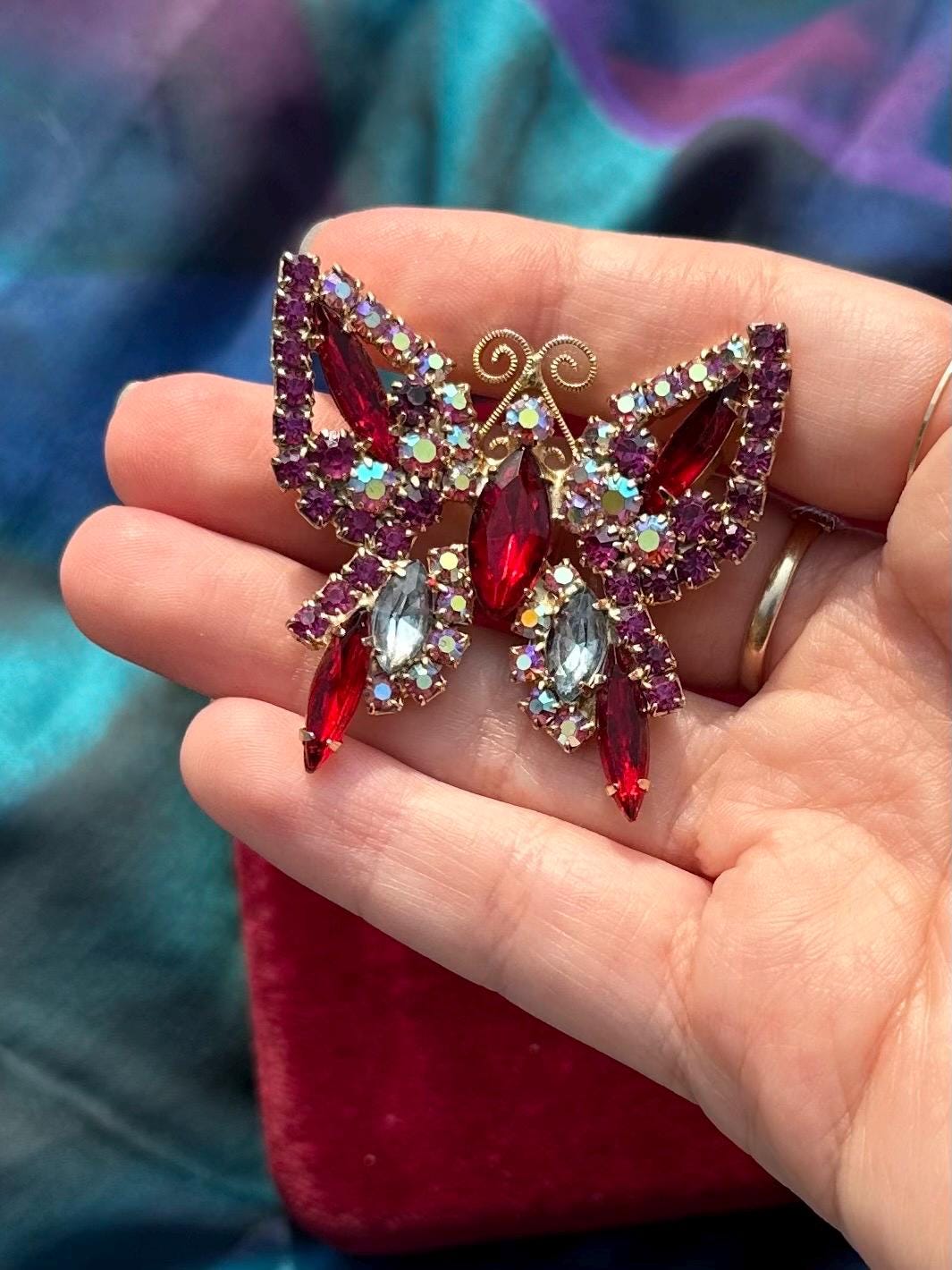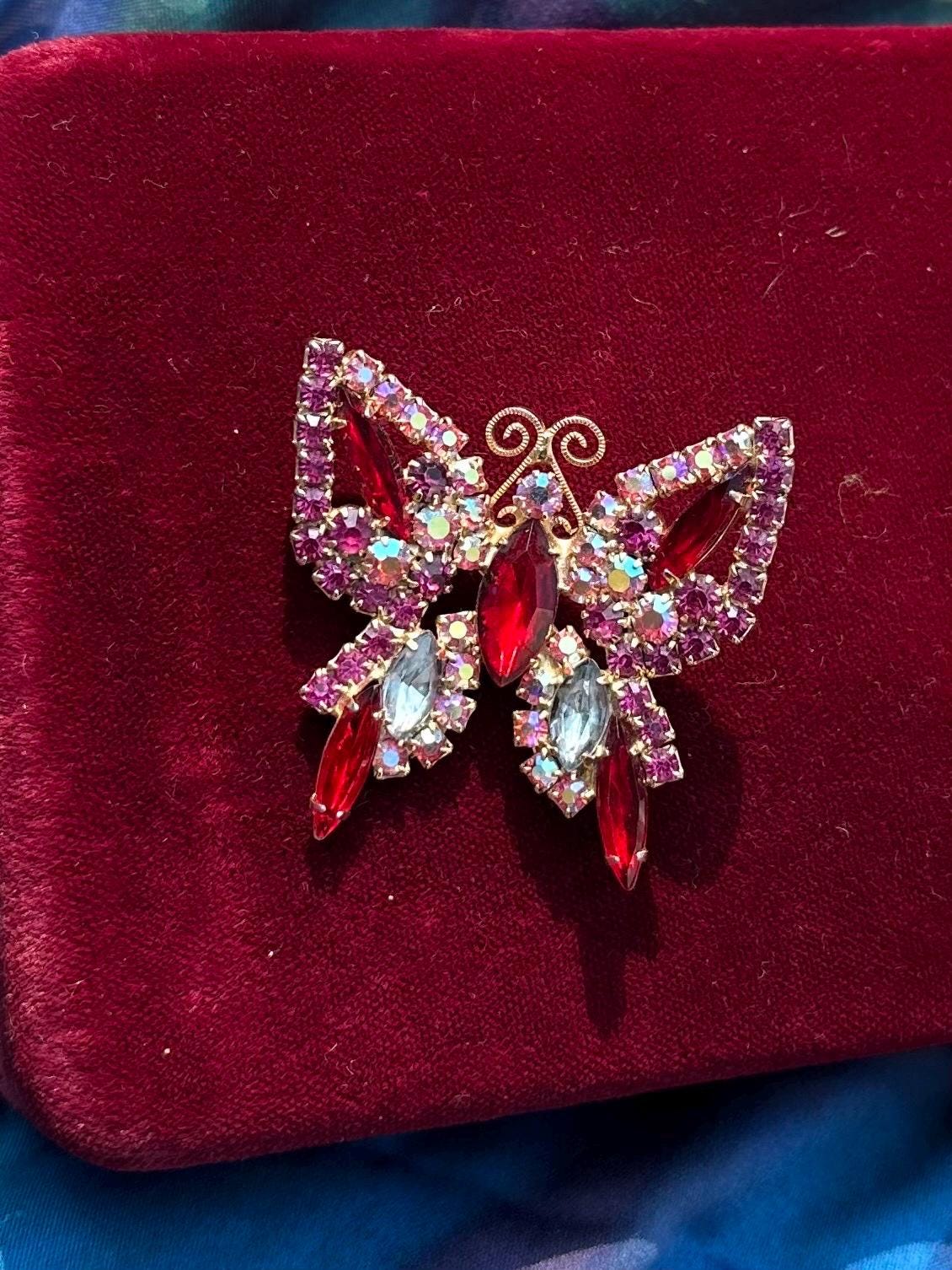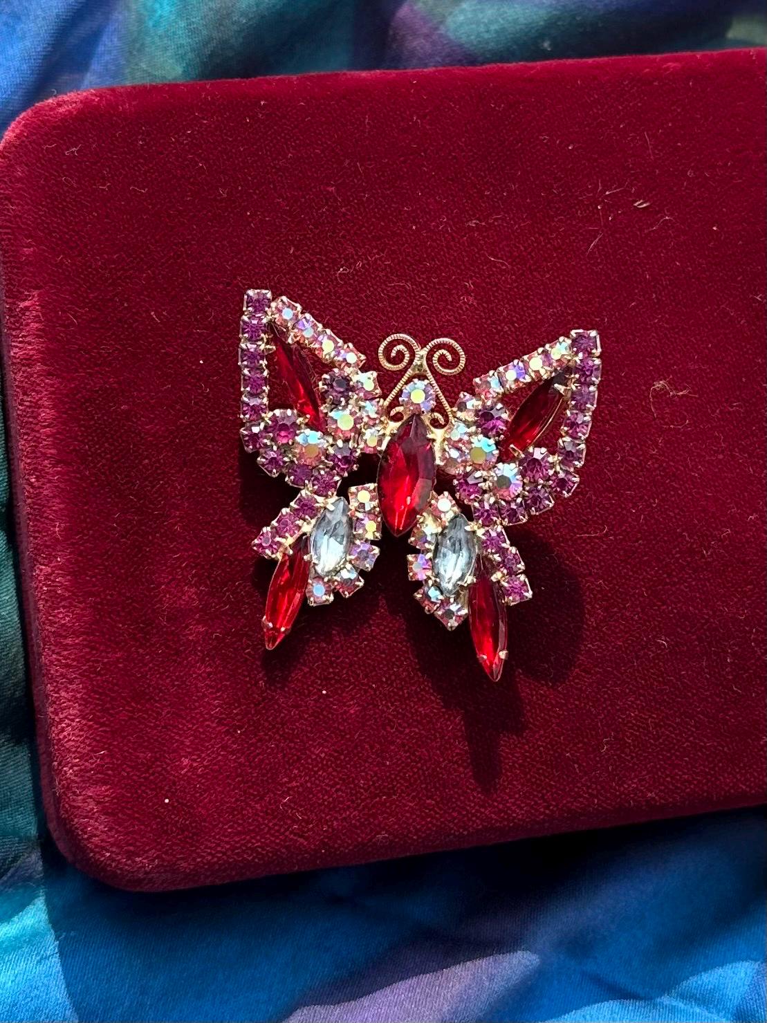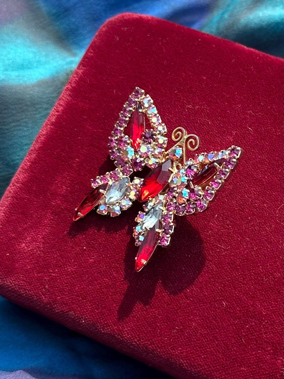 1960s Midcentury Red, Pink & Aurora Borealis AB Faceted Rhinestone Butterfly Brooch