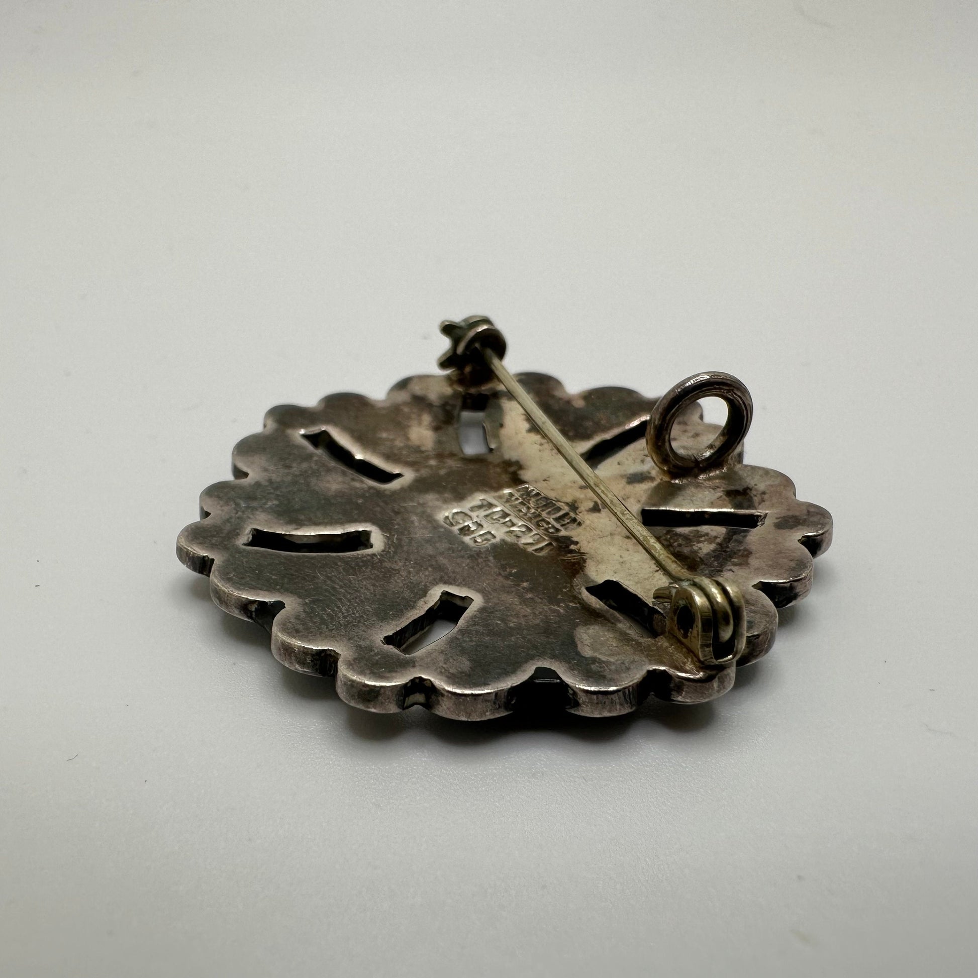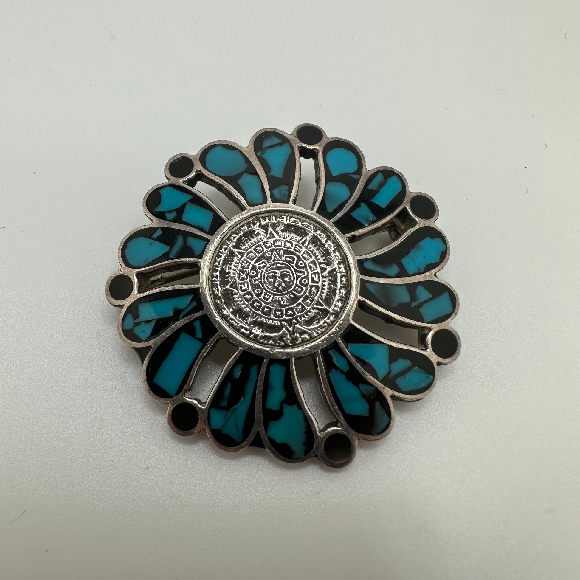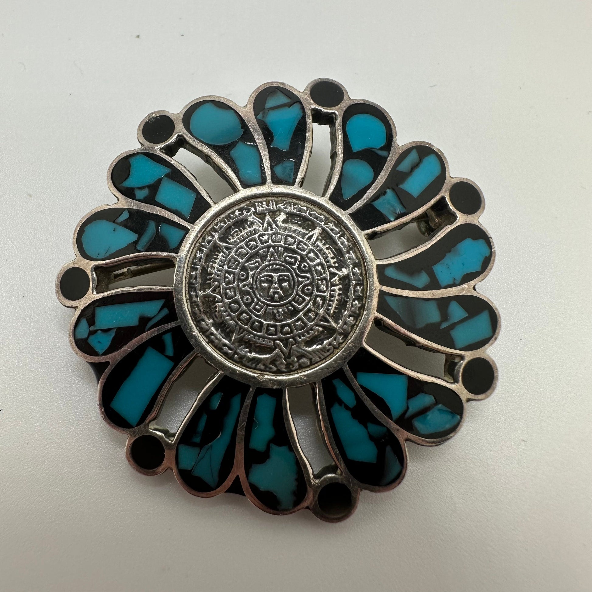 Vintage Signed Sterling Silver Taxco Mexico Genuine Turquoise Inlay Aztec Calendar Pin Brooch