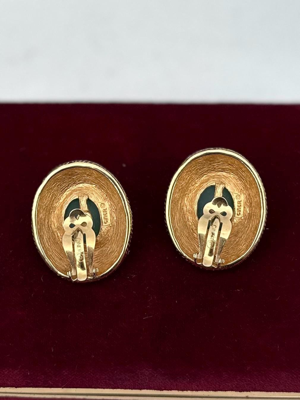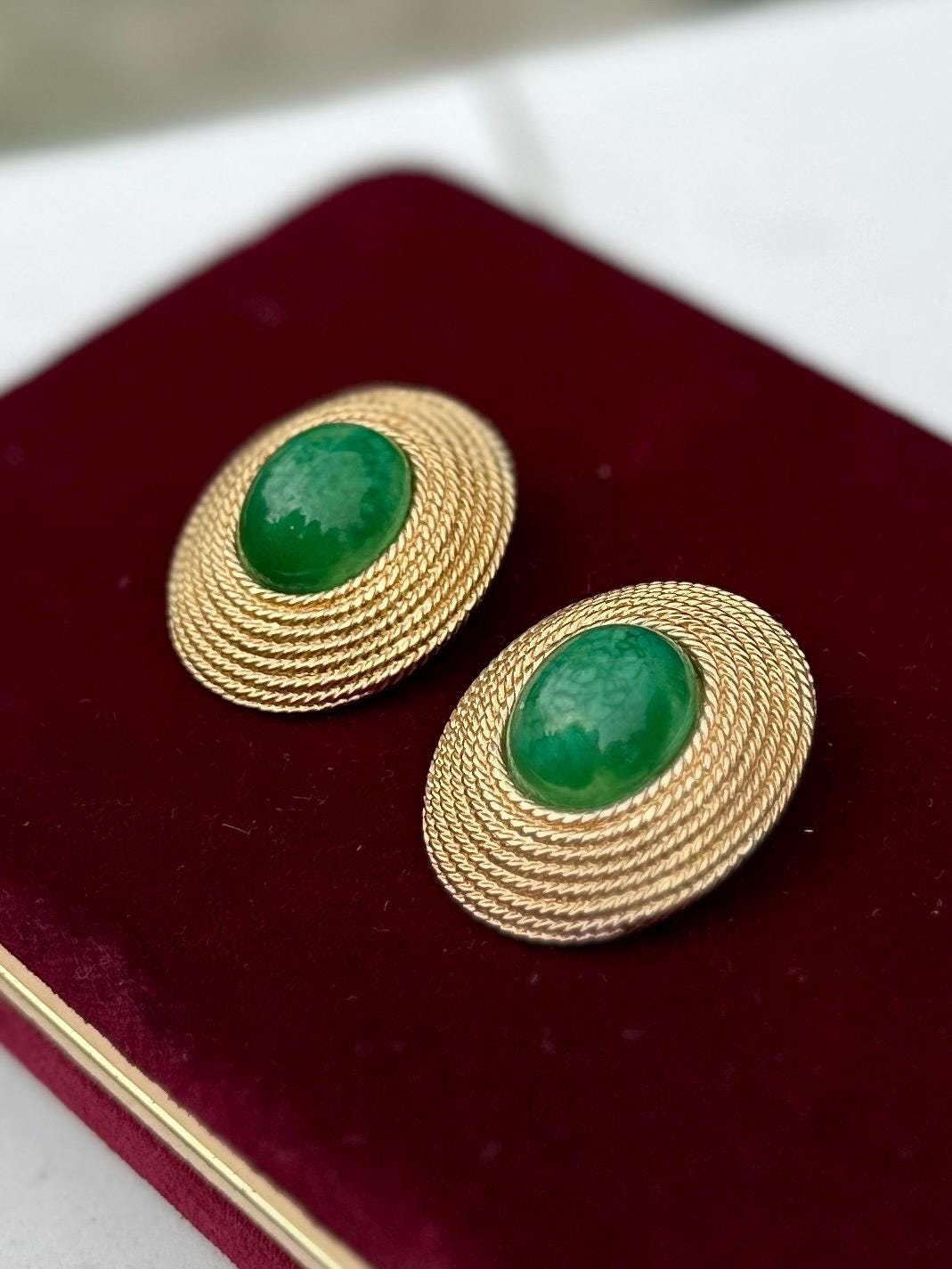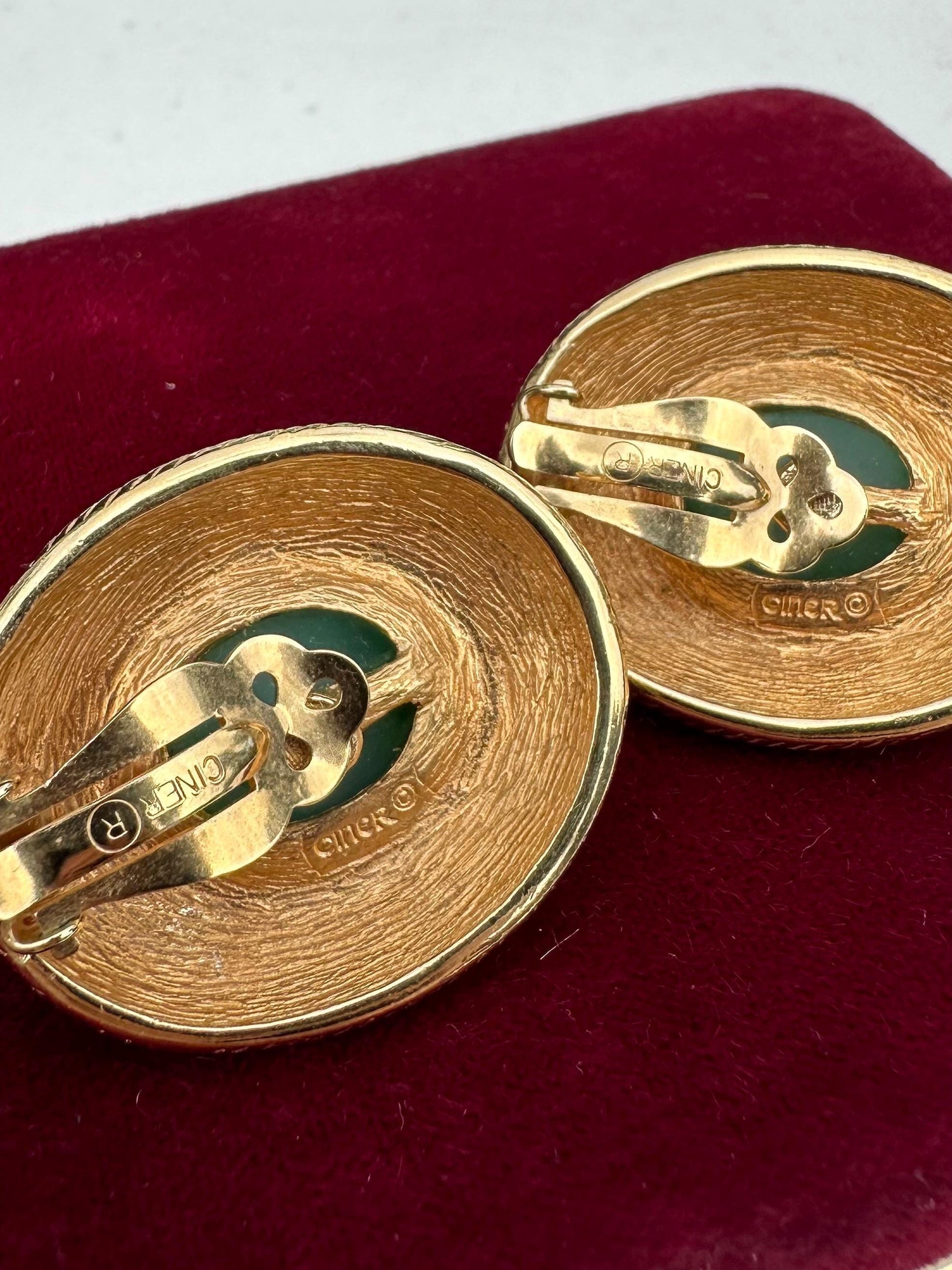 Vintage Signed CINER Gold Tone & Green Peking Glass Cabochon Large Statement Clip-on Earrings