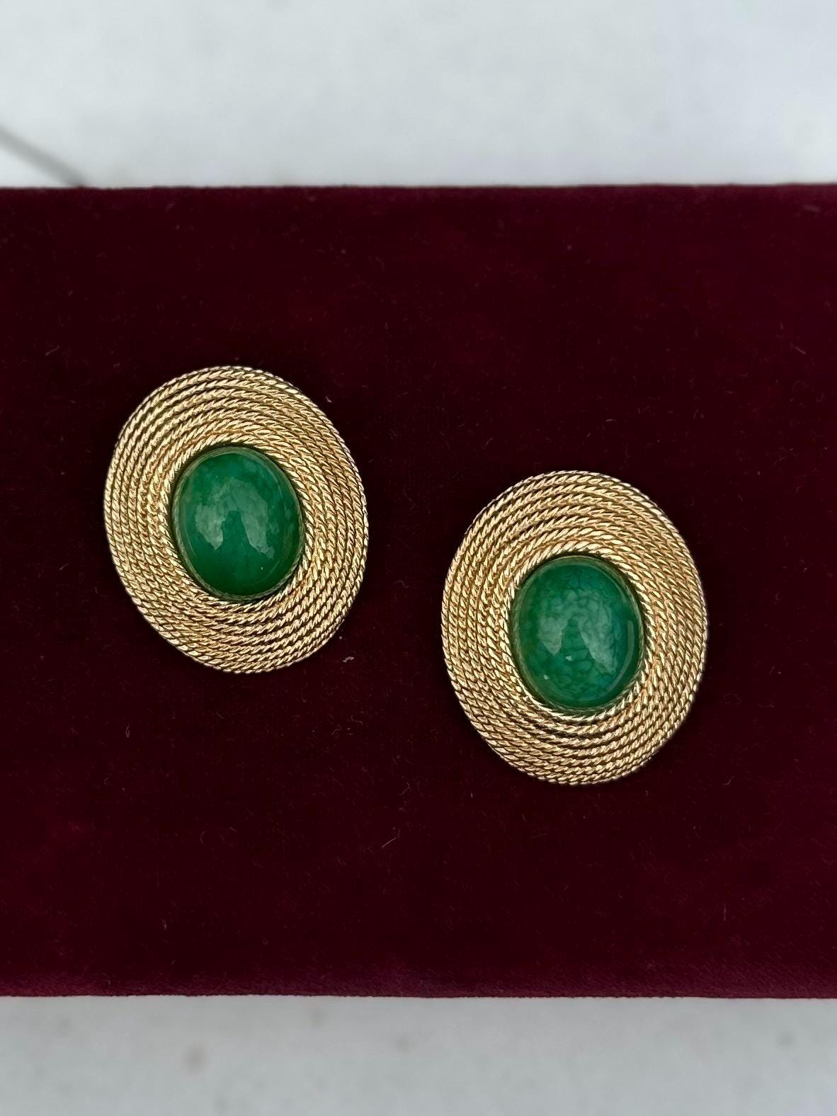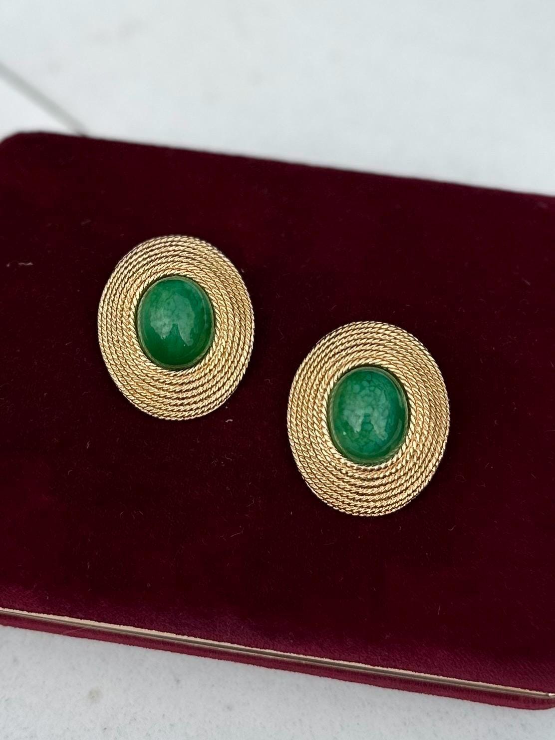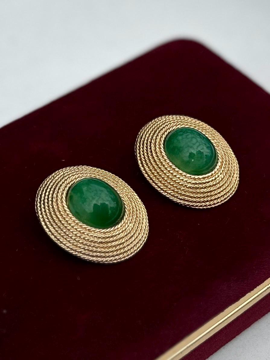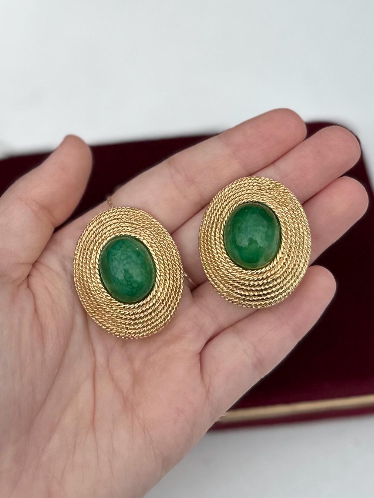 Vintage Signed CINER Gold Tone & Green Peking Glass Cabochon Large Statement Clip-on Earrings