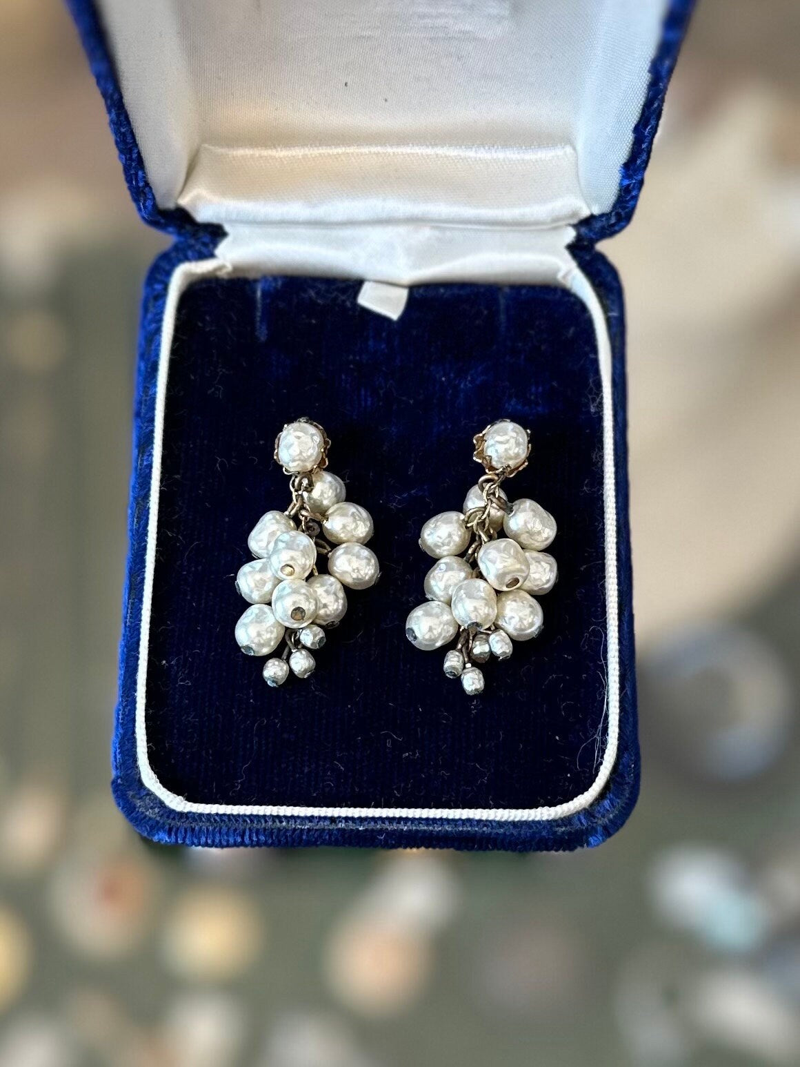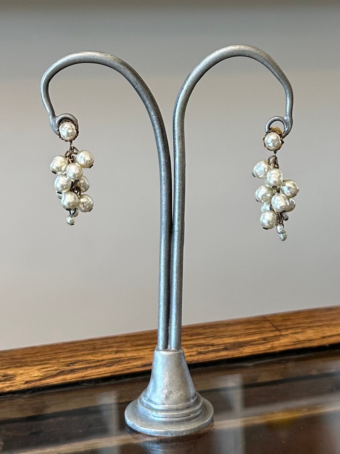 Vintage Signed Miriam Haskell Baroque Faux Pearl Cluster Dangle Earrings Gold Tone