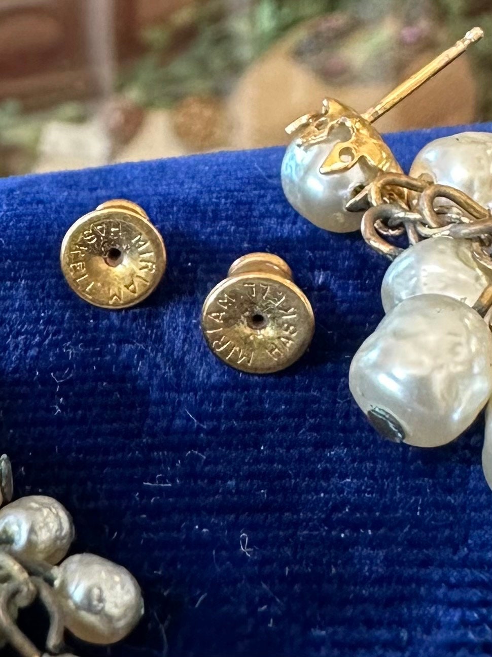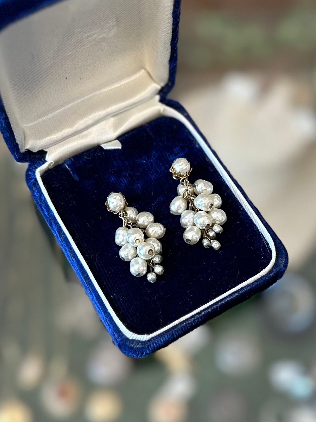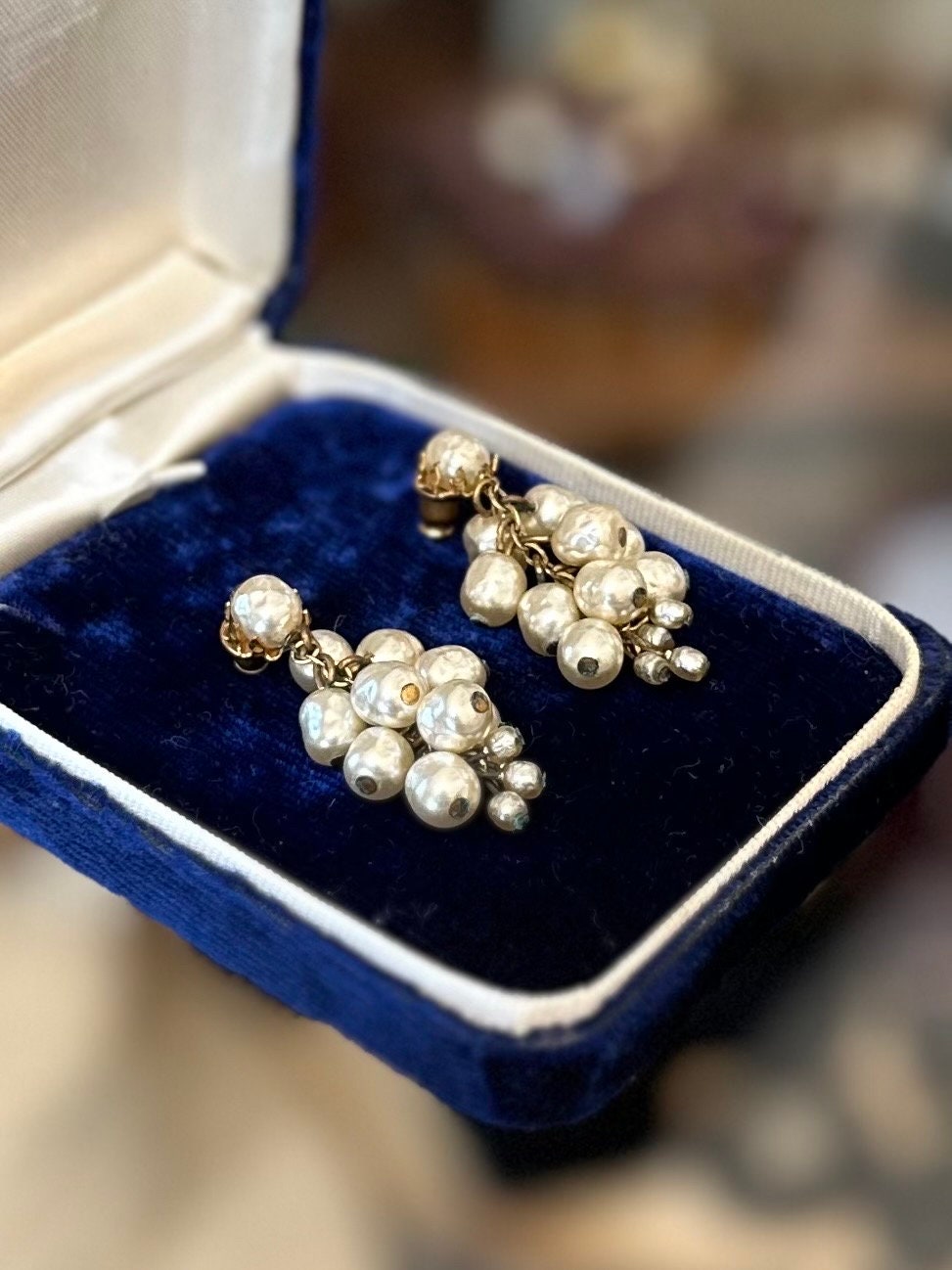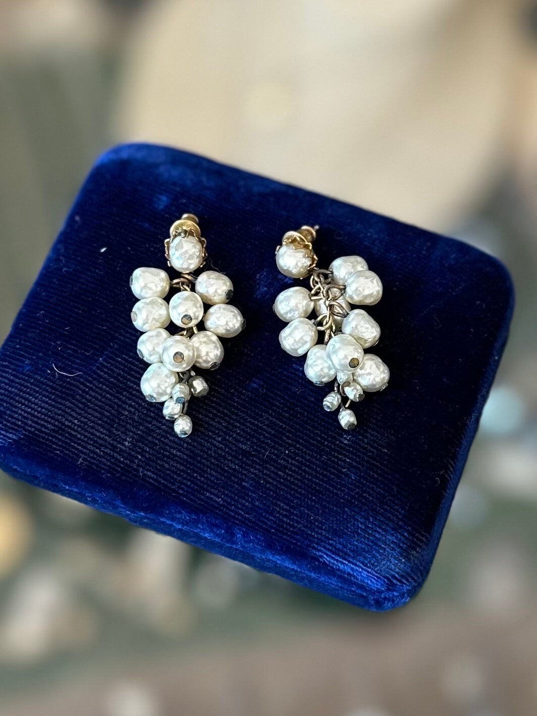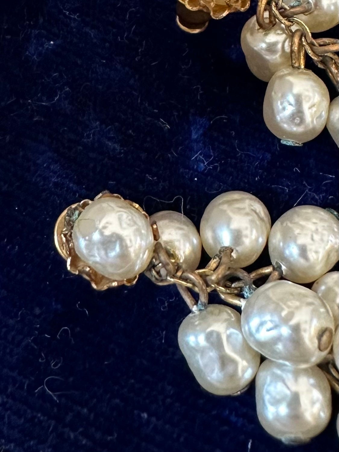 In good condition. Some minir tarnish to gold tone metal, and one pearl has some wear, as pictured. Please see all photos. Please note box in photos is not included.