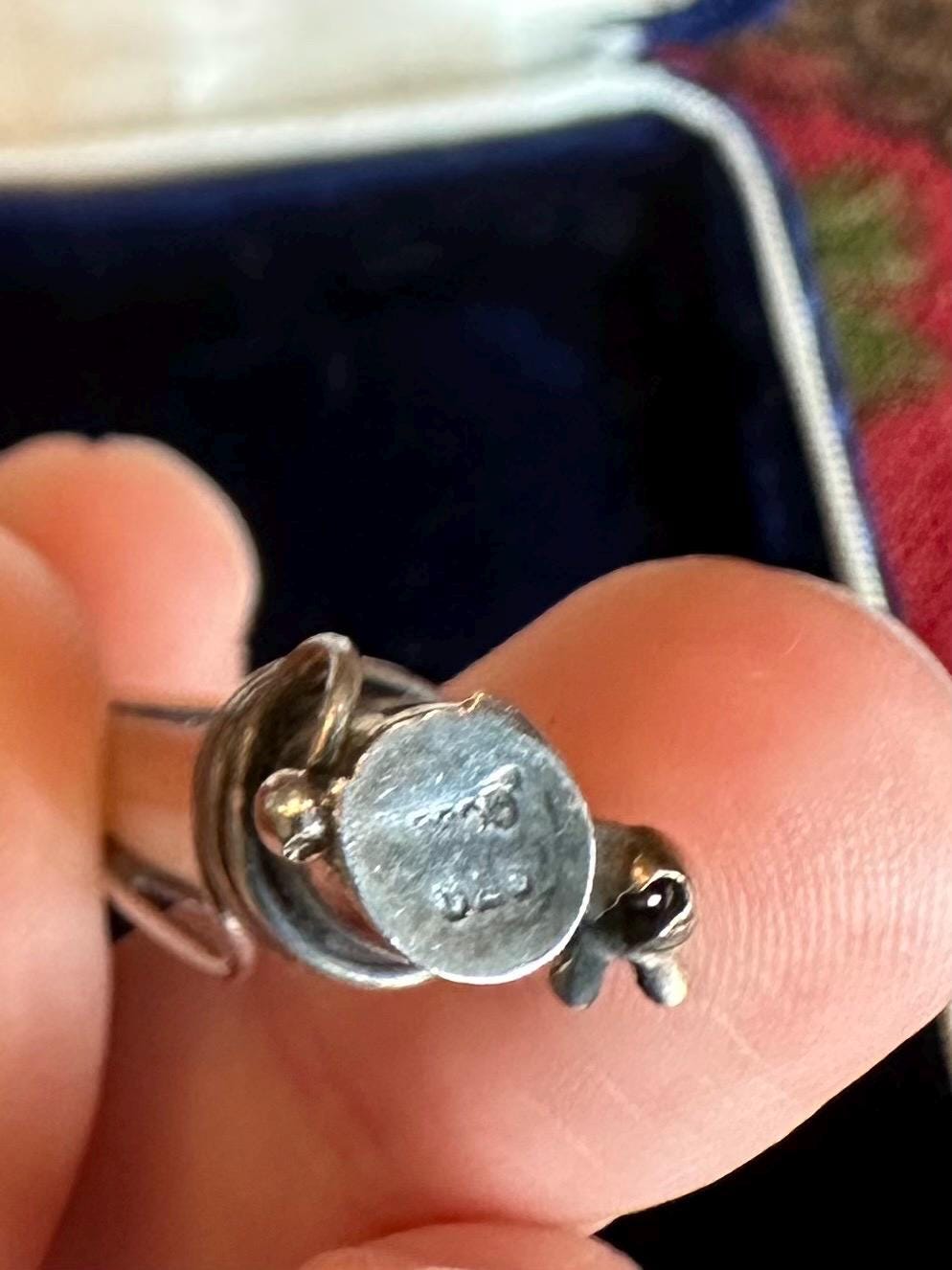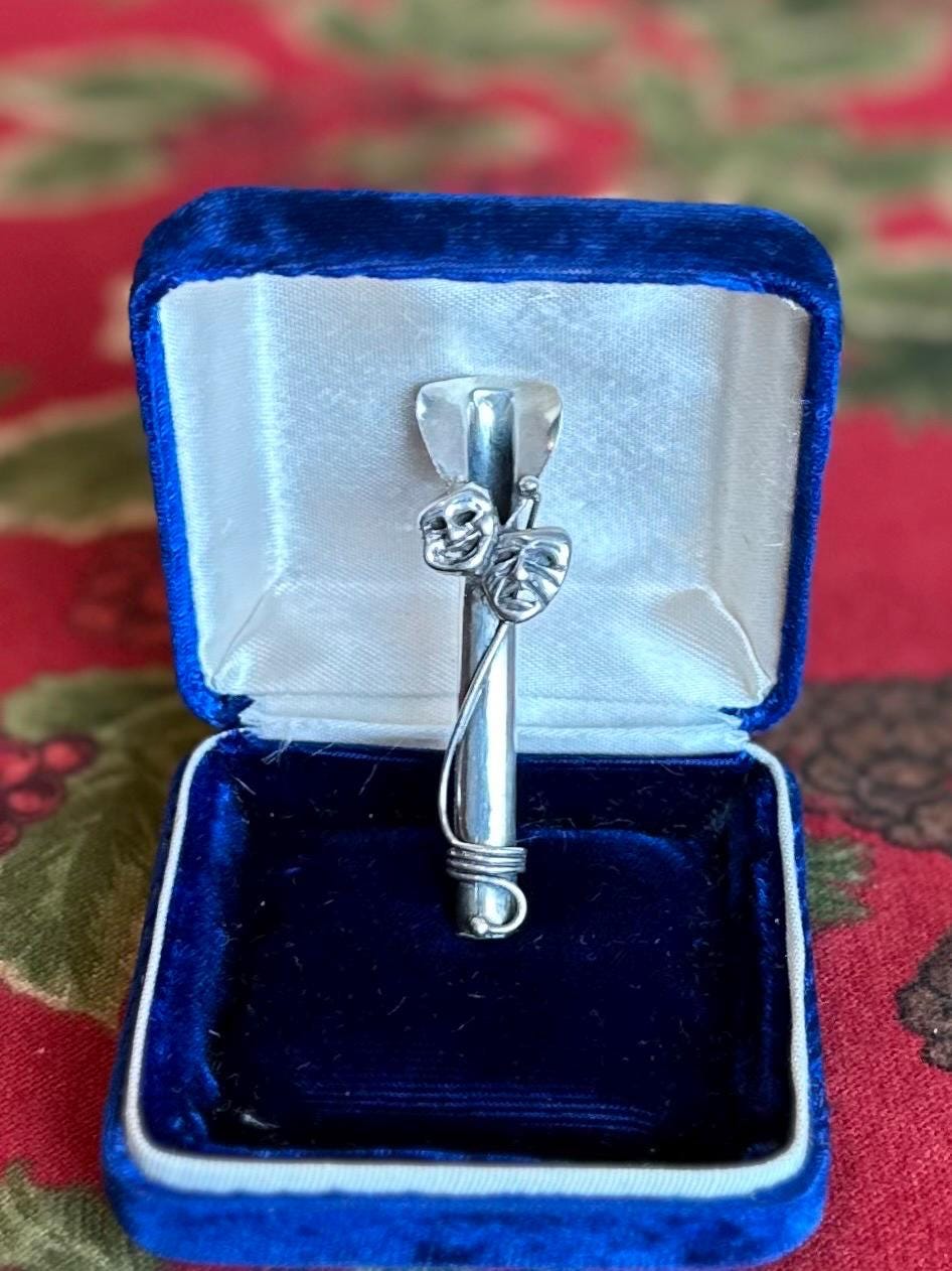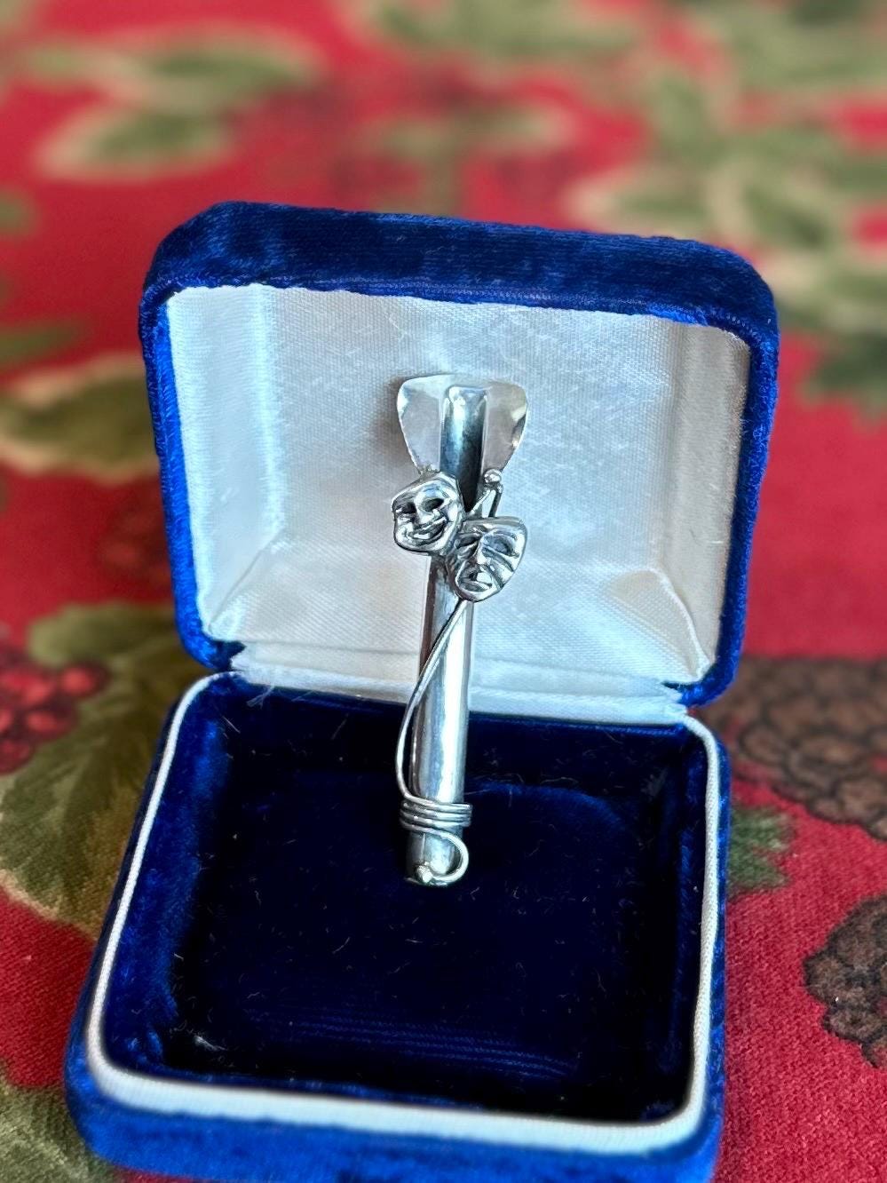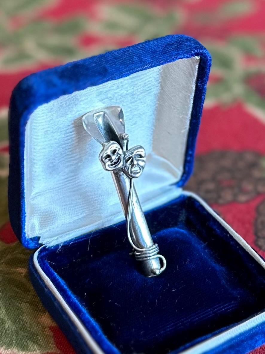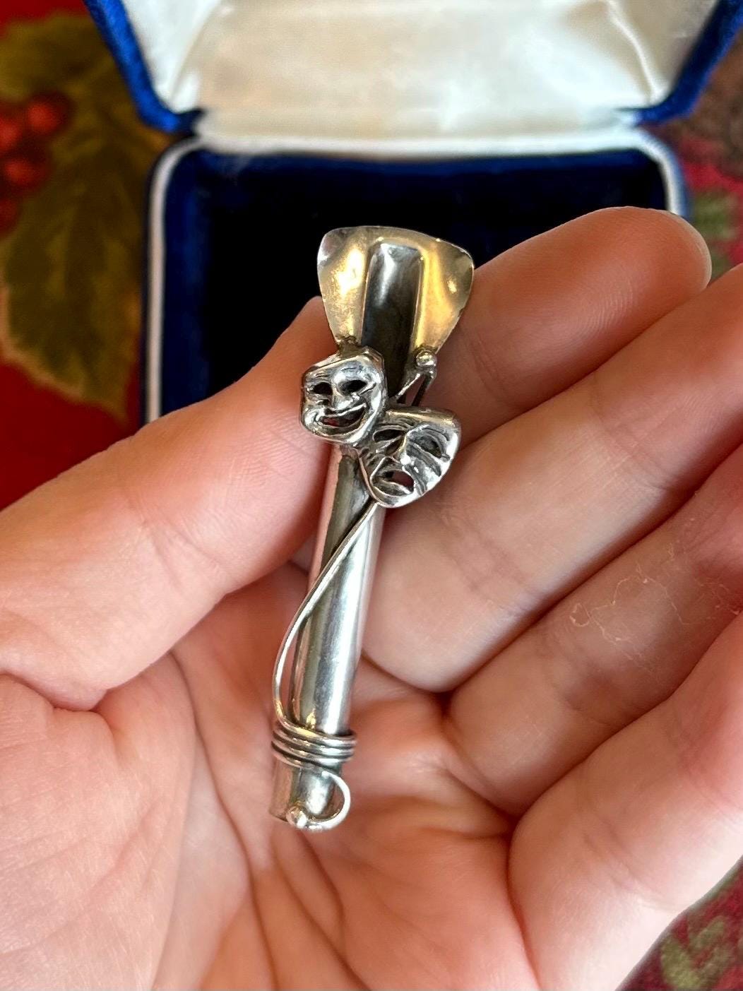 Unique vintage sterling silver brooch/pin with the purpose of holding small flowers. Adorned with the comedy & tragedy masks. Would make a perfect gift for a theater lover!