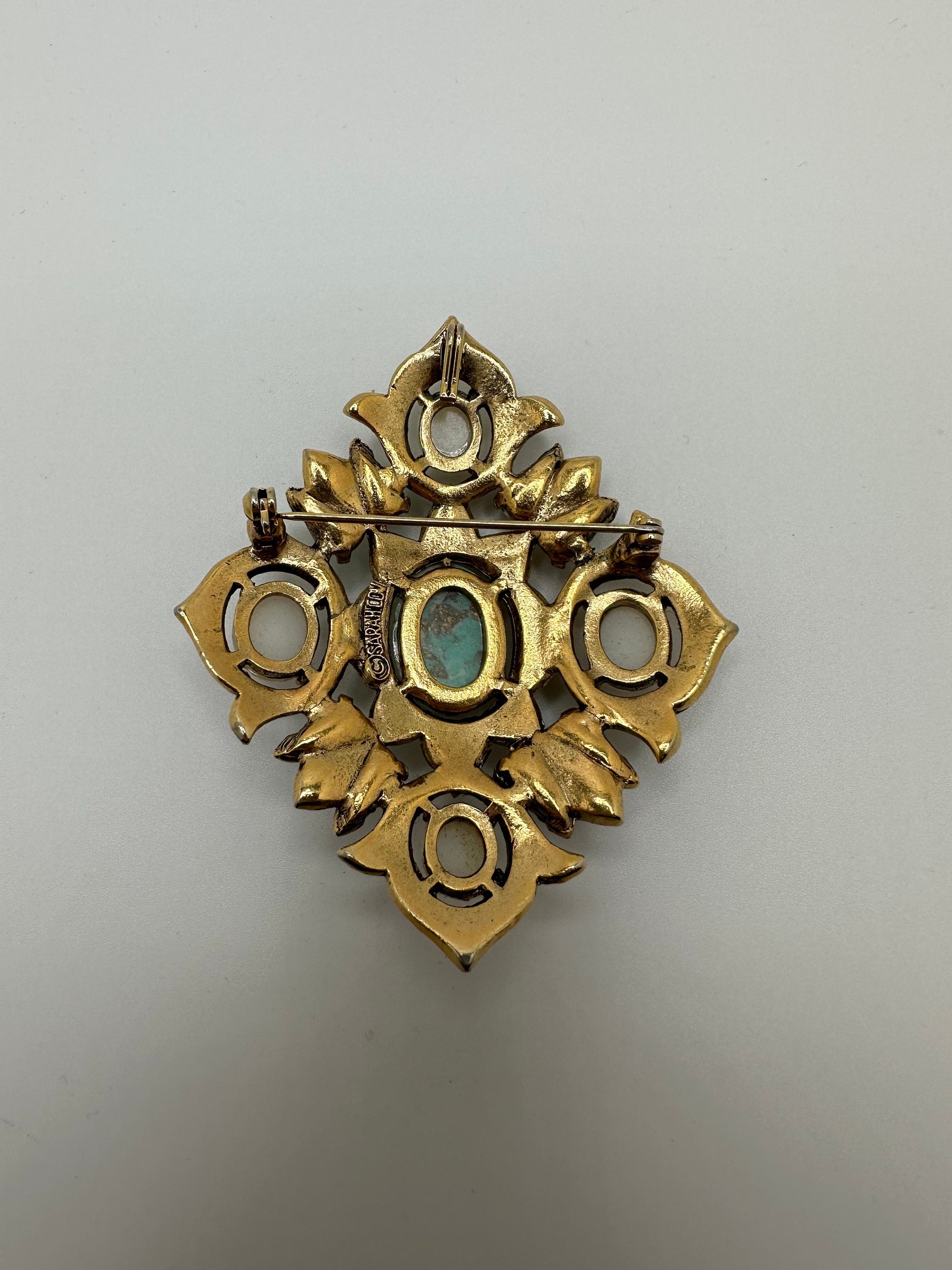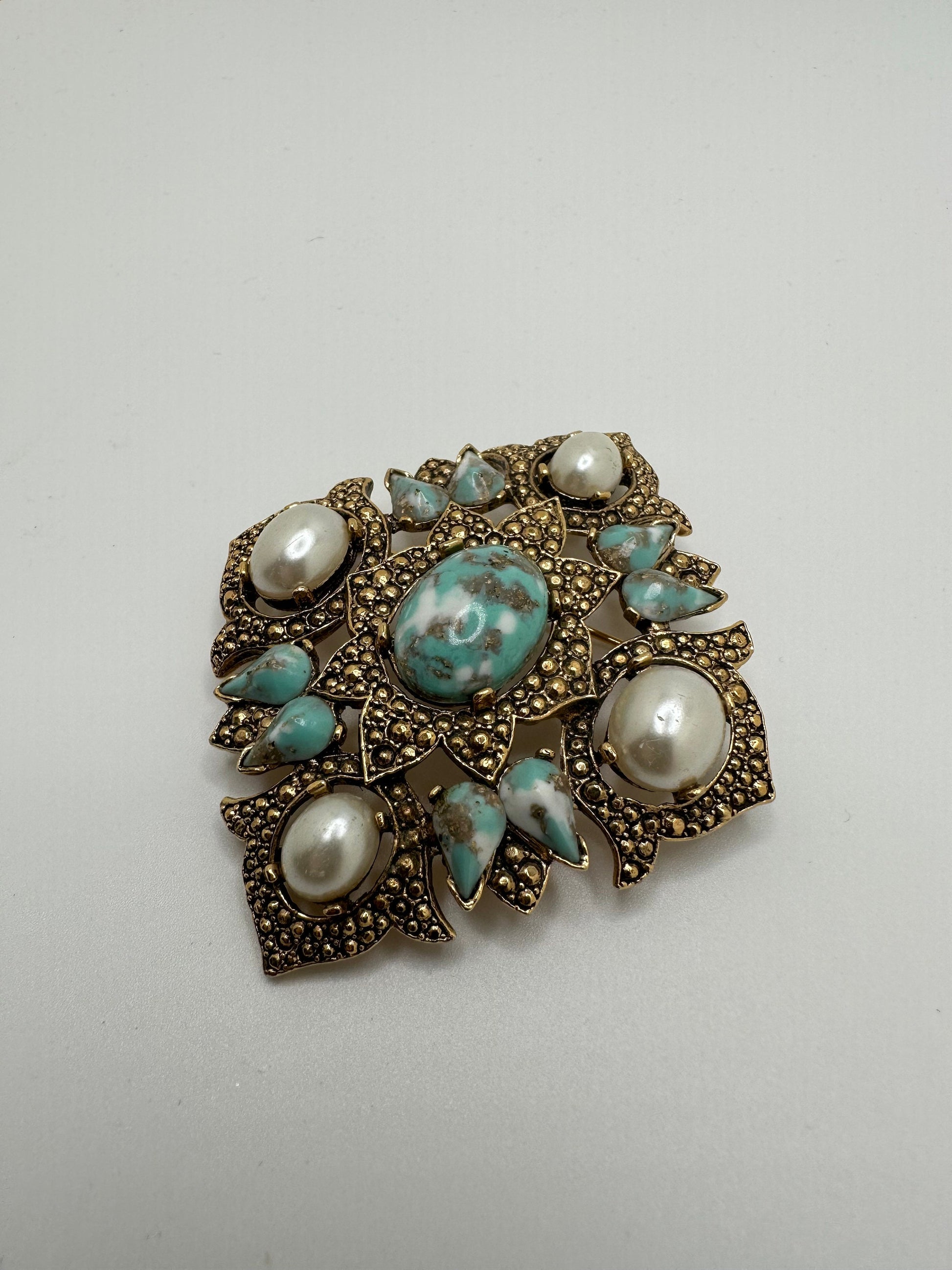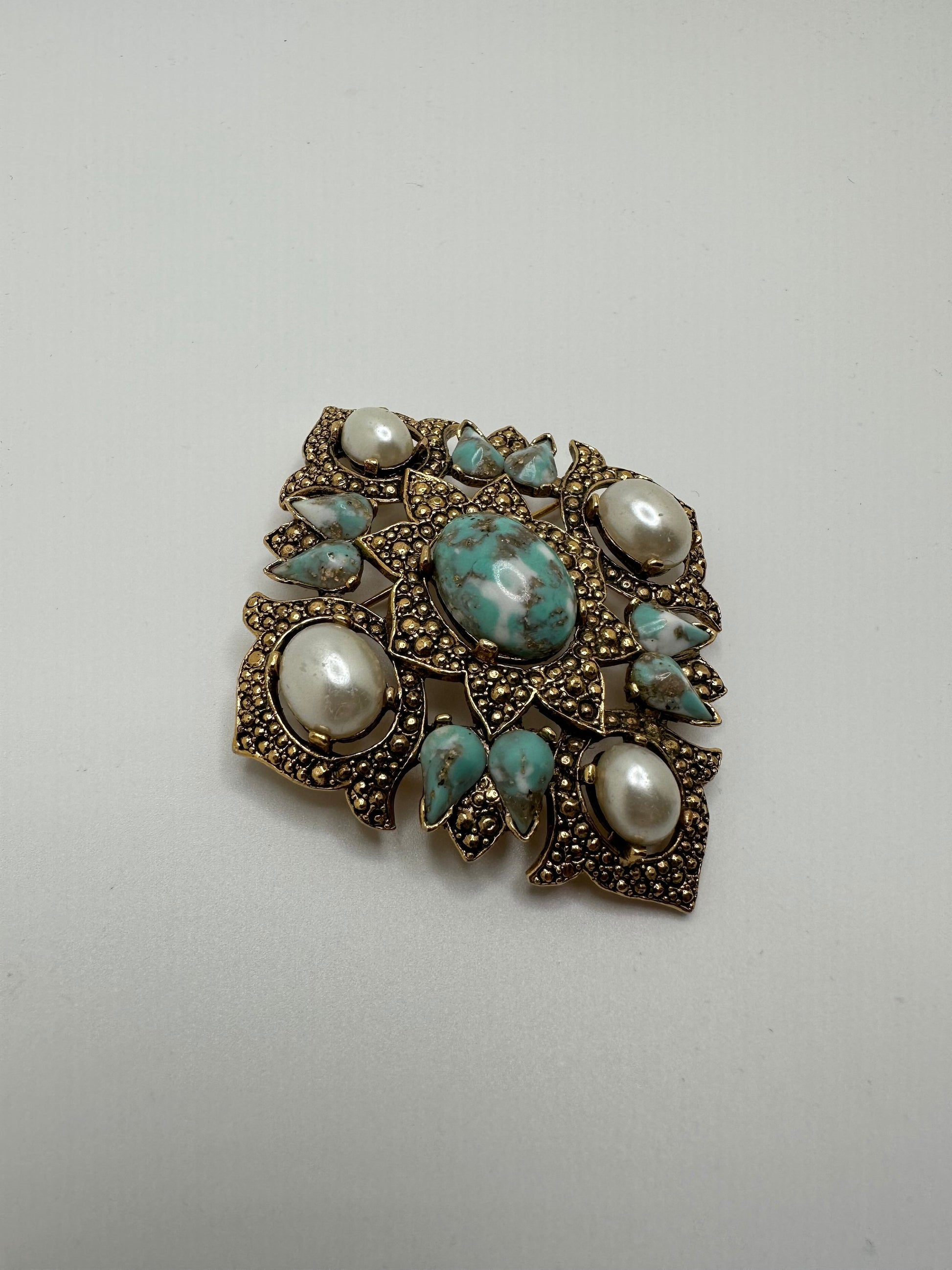 1960s Signed Sarah Coventry 'Remembrance' Brooch or Pendant with Faux Pearls and Turquoise Cabochon Center