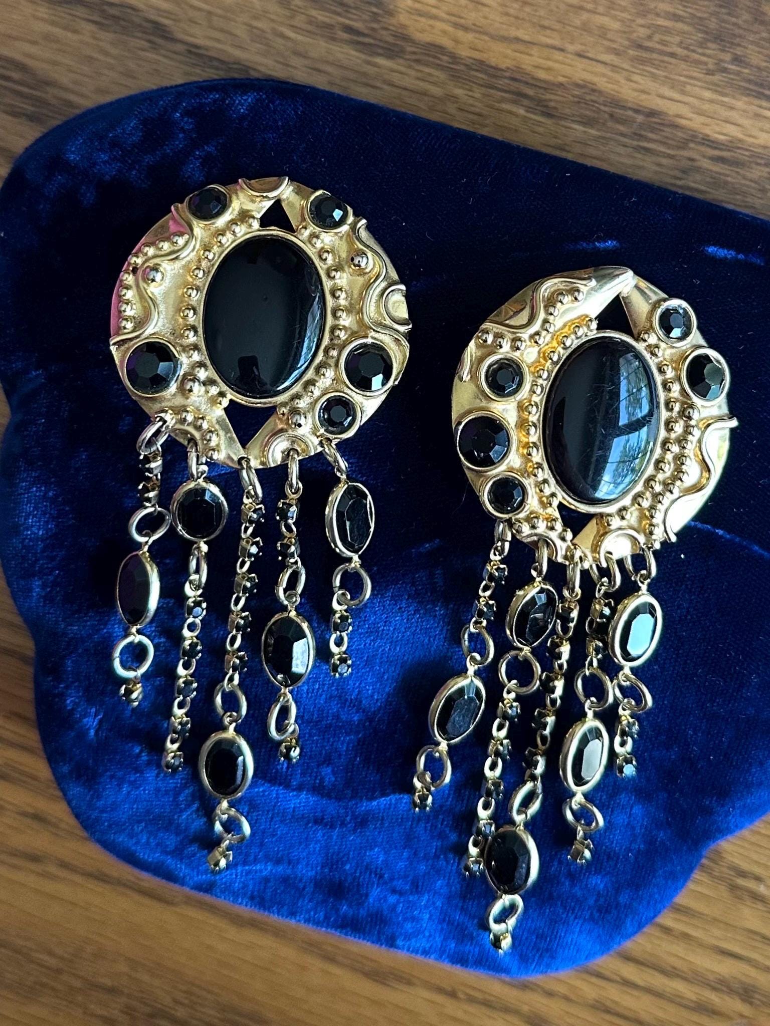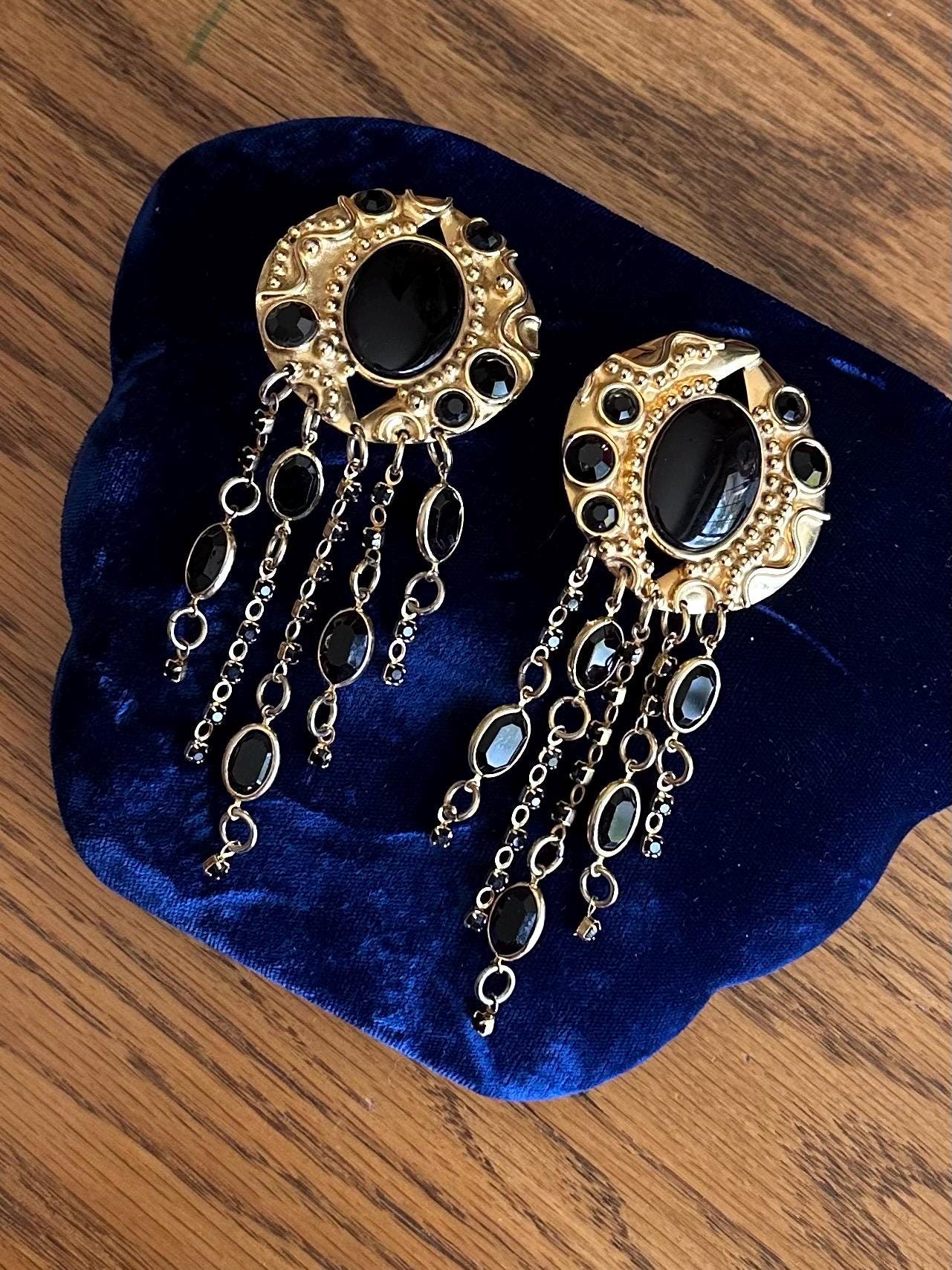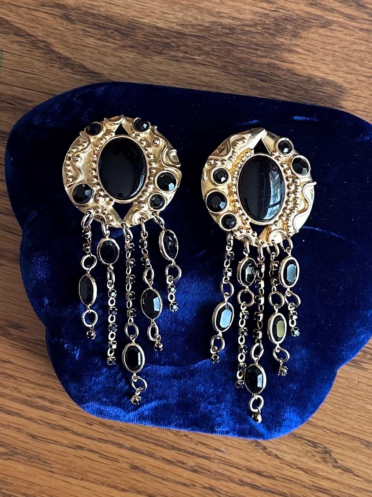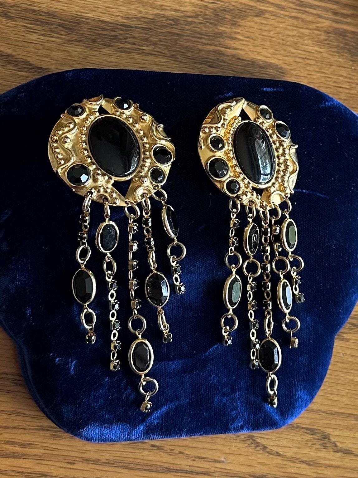 1980s 1990s Signed SORRELLI Gold Tone & Black Rhinestone and Crystal Chandelier Statement Clip-on Earrings Runway