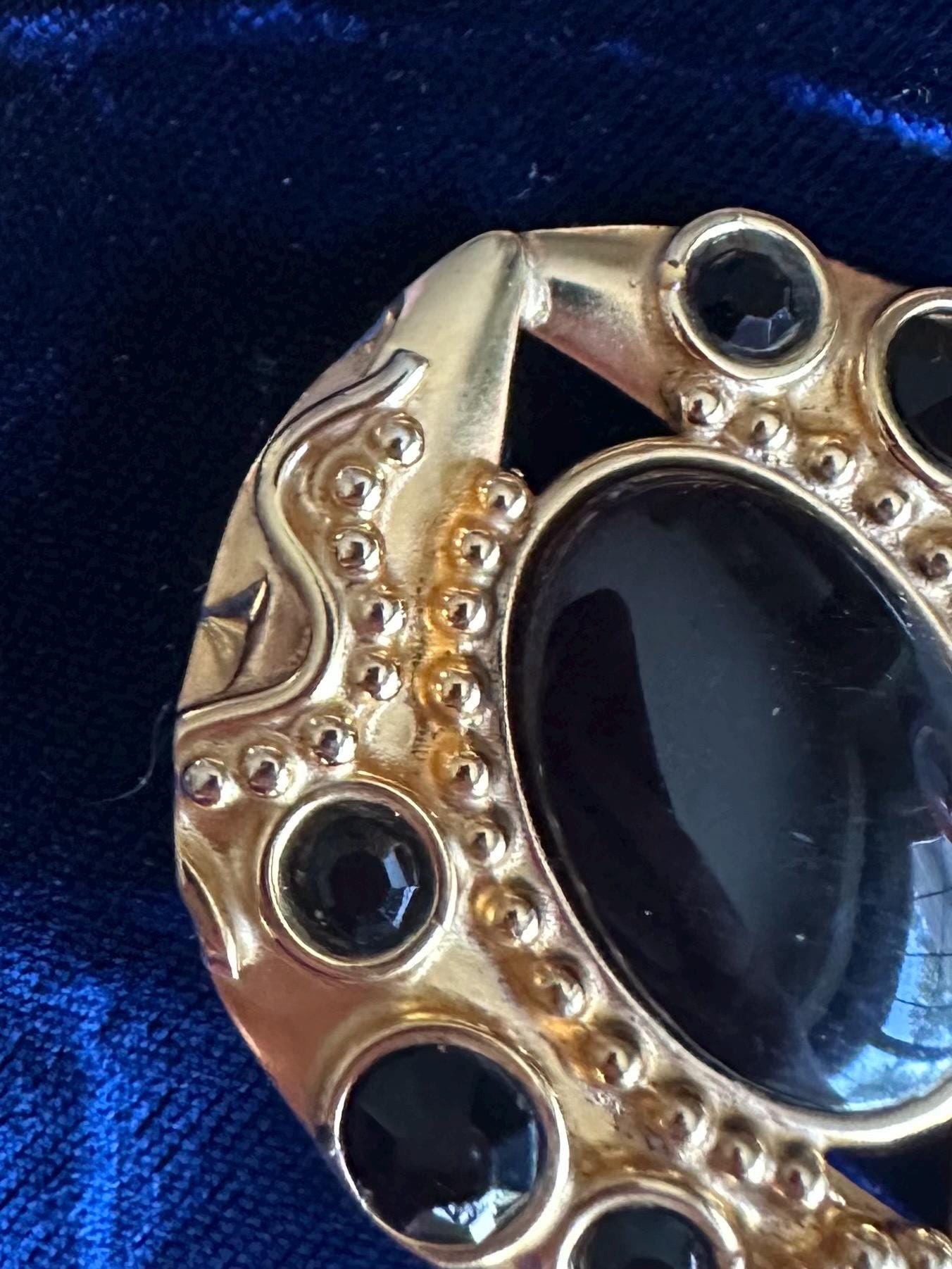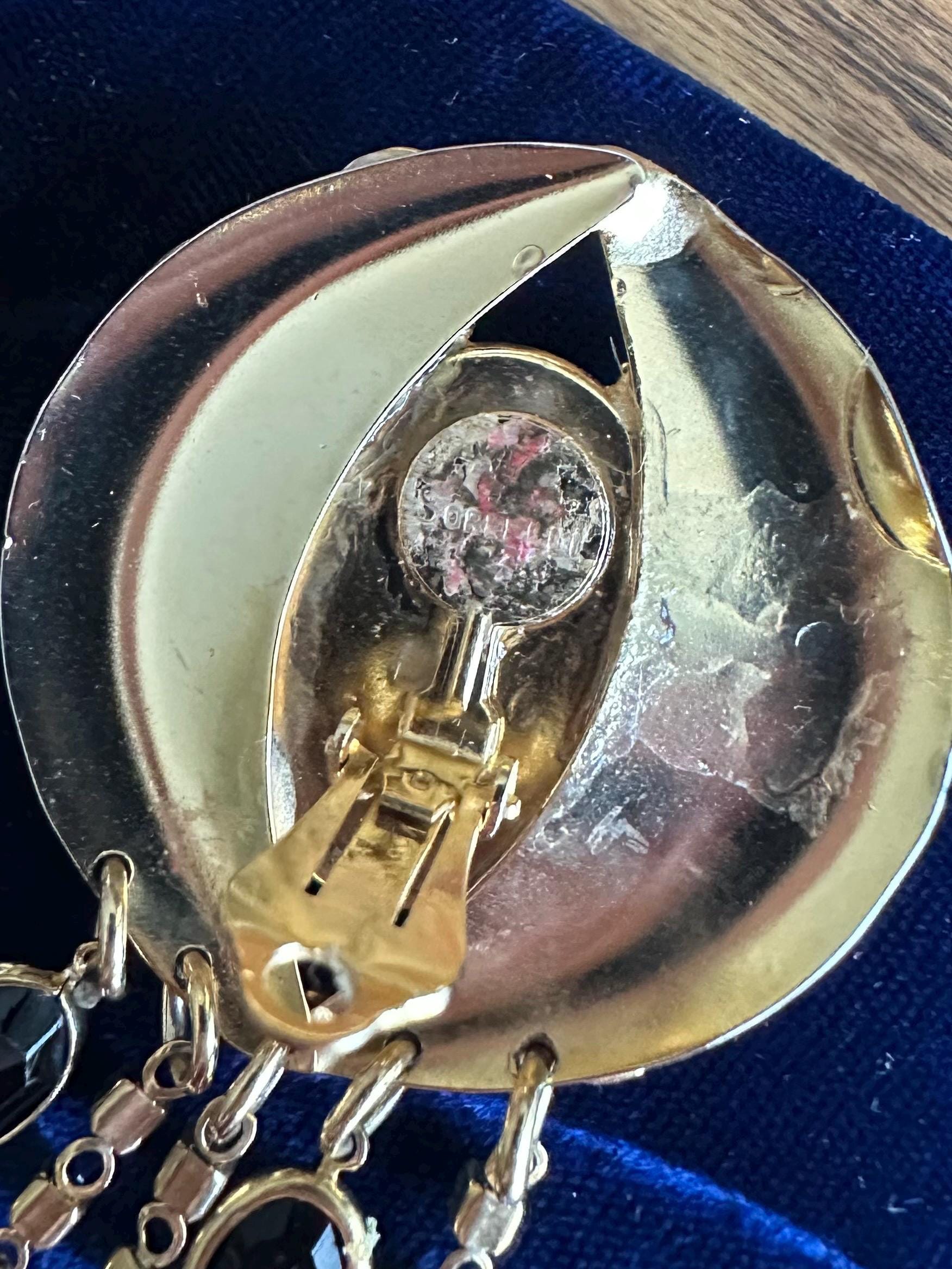 In good condition. All rhinestones are present and intact. One of the earrings appears to have some minor cracking in the gold plating on the top front outer edge, as pictured. Also has some red marks and what appears to be possibly some adhesive on the backside of earring, also pictured. Please see all photos.