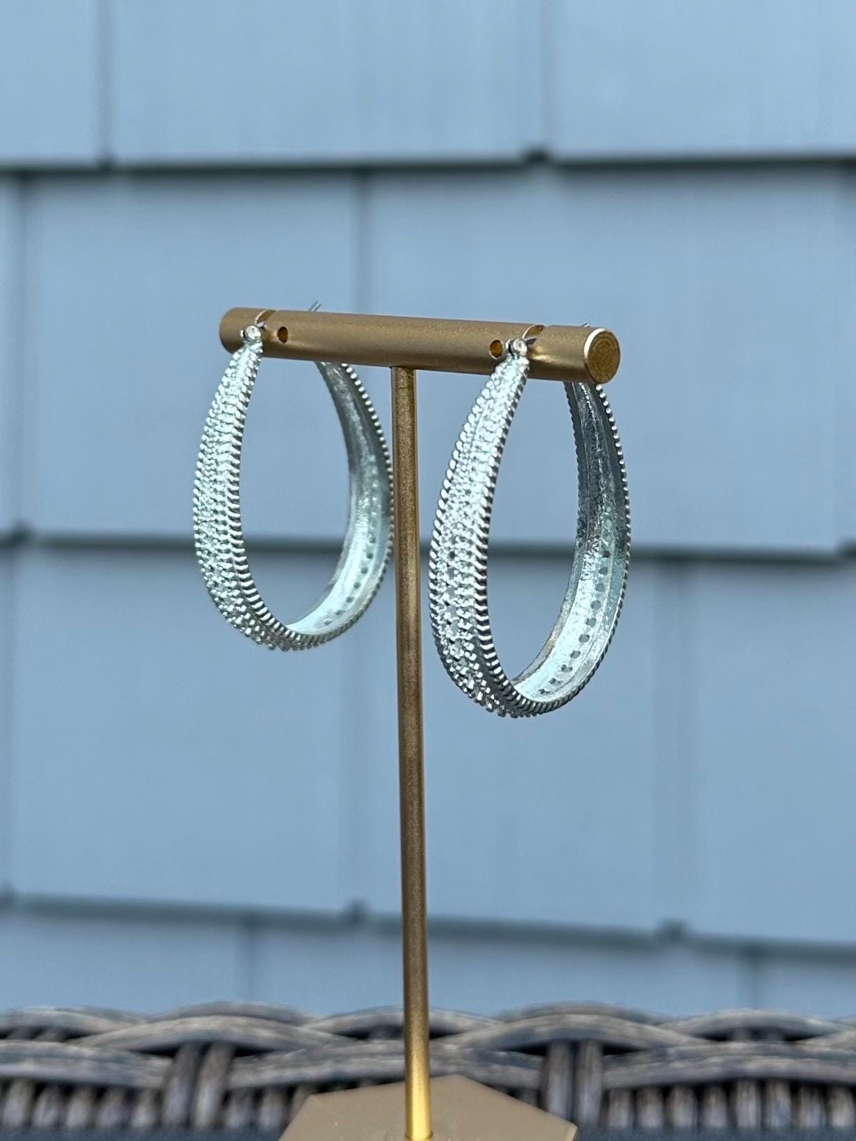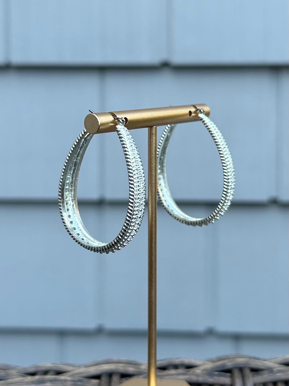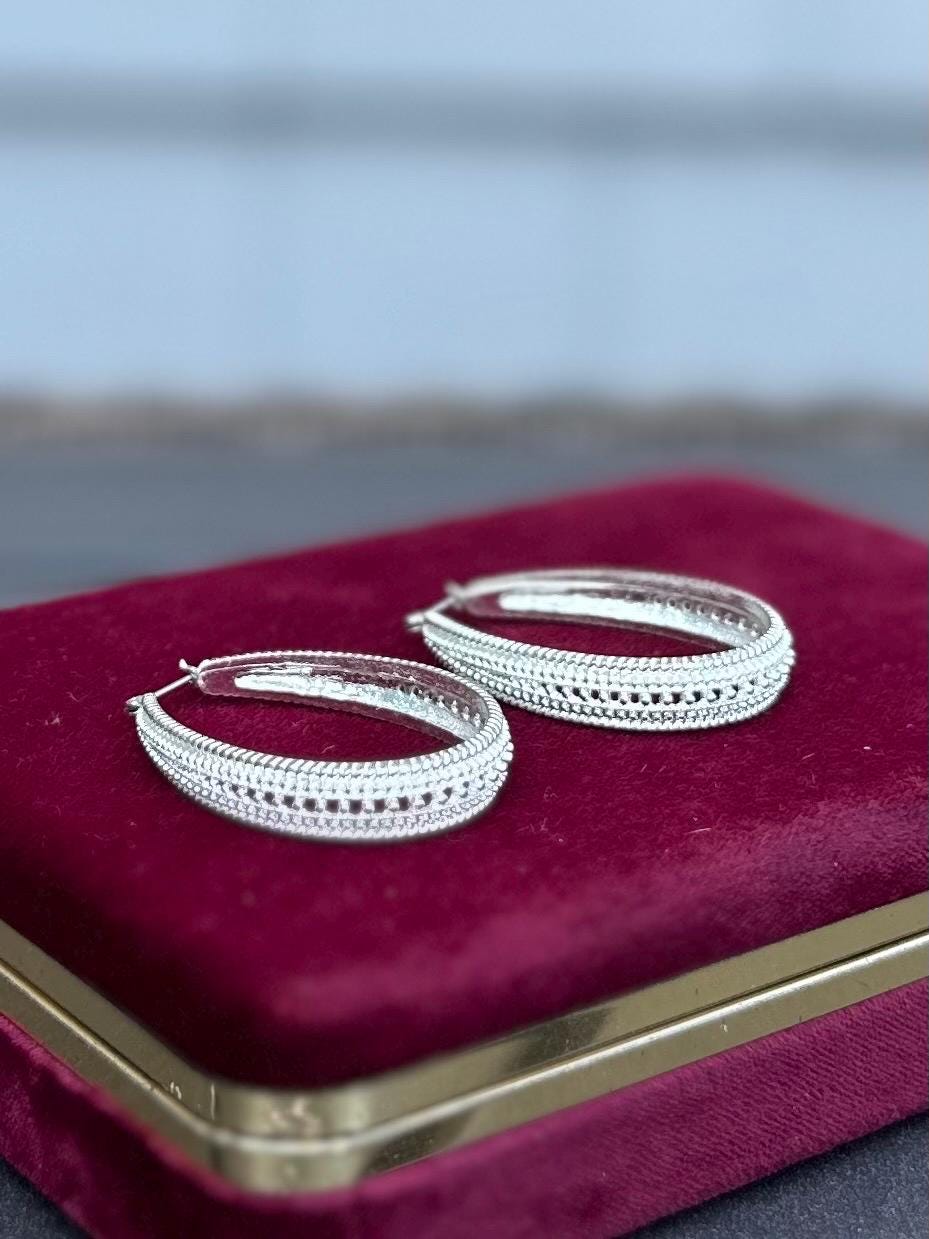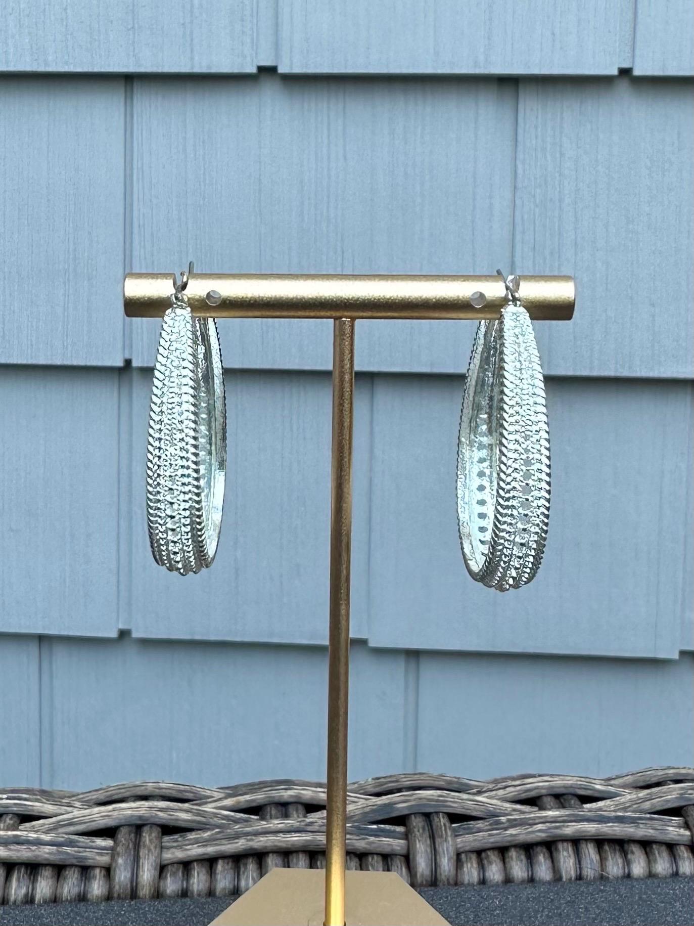 Simple yet beautiful textured silver tone oval hoop pierced earrings.