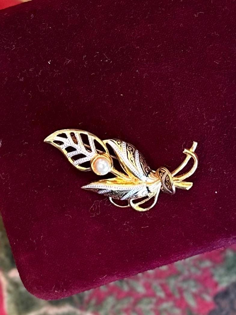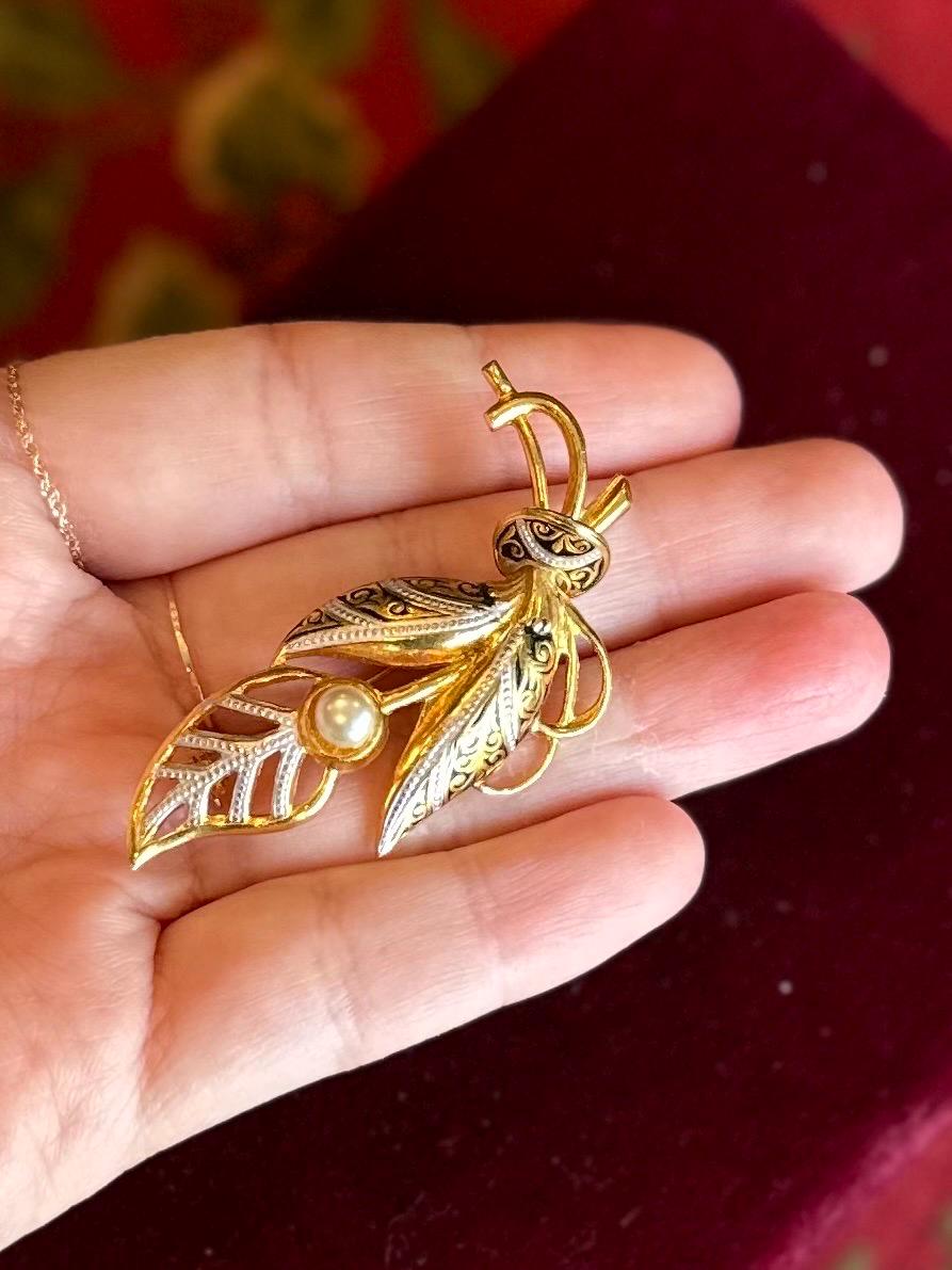 1970s Spanish Damascene Toledo Gold Tone Silver Tone & Black with Faux Pearl Brooch