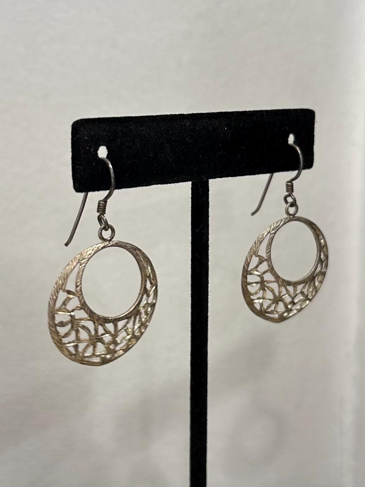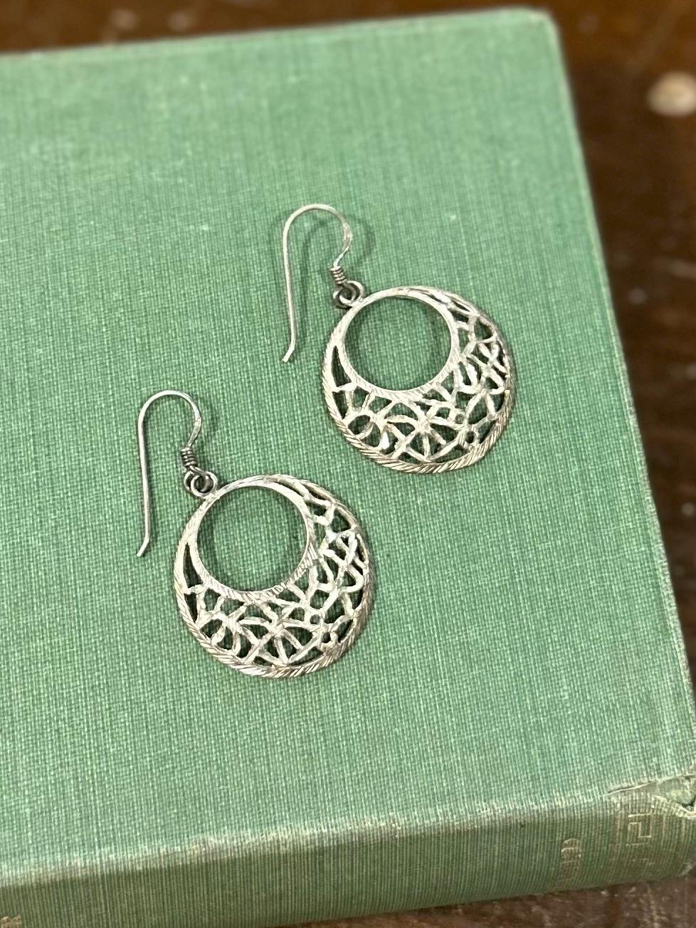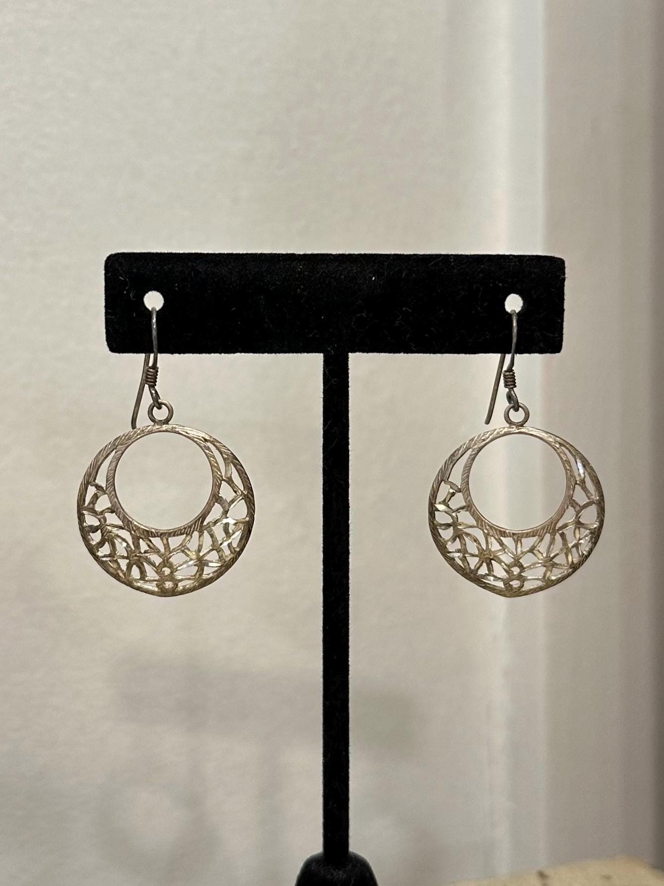 Vintage Sterling Silver 925 Open Circle Ornate Etched Dangle Earrings
