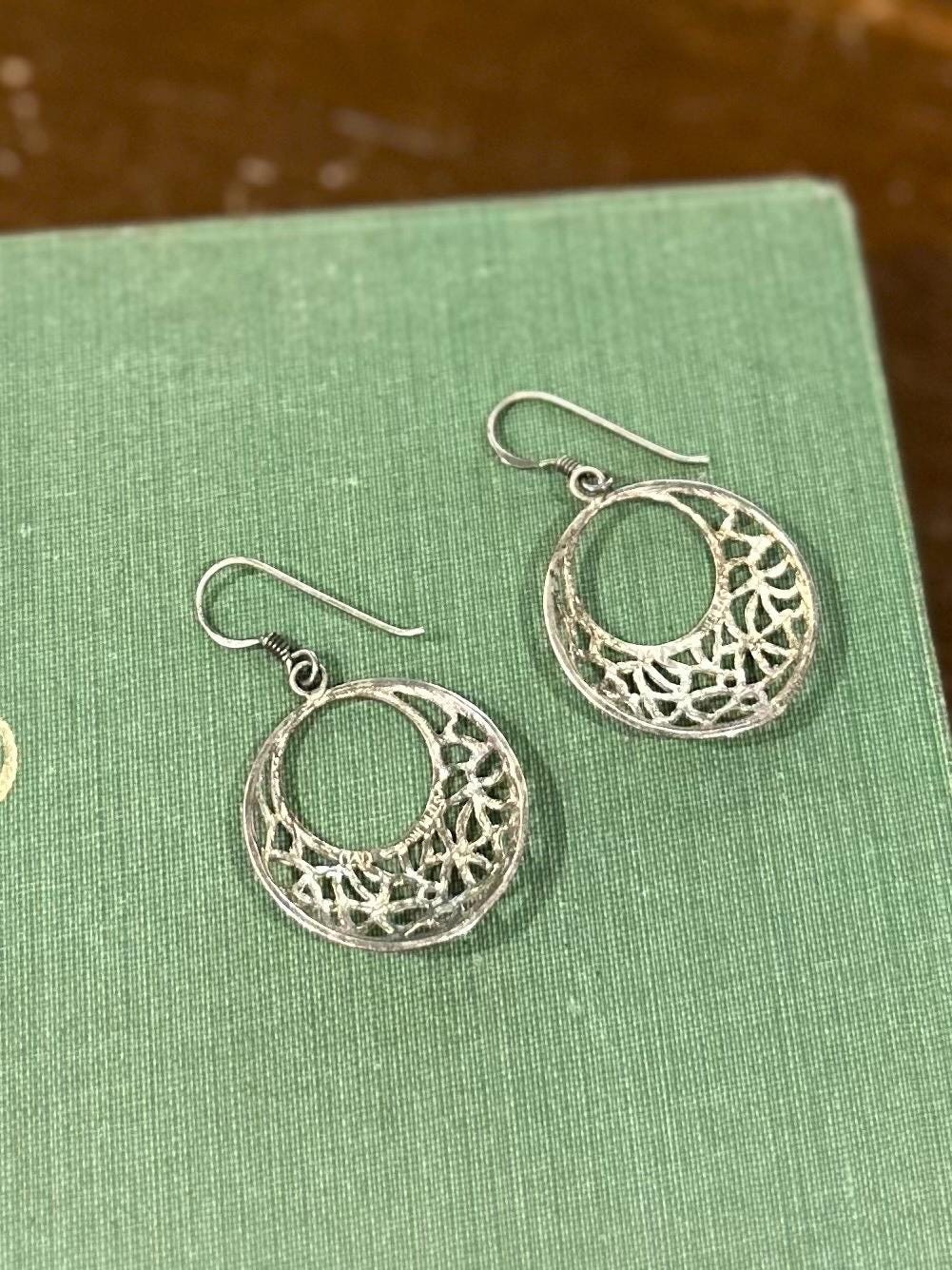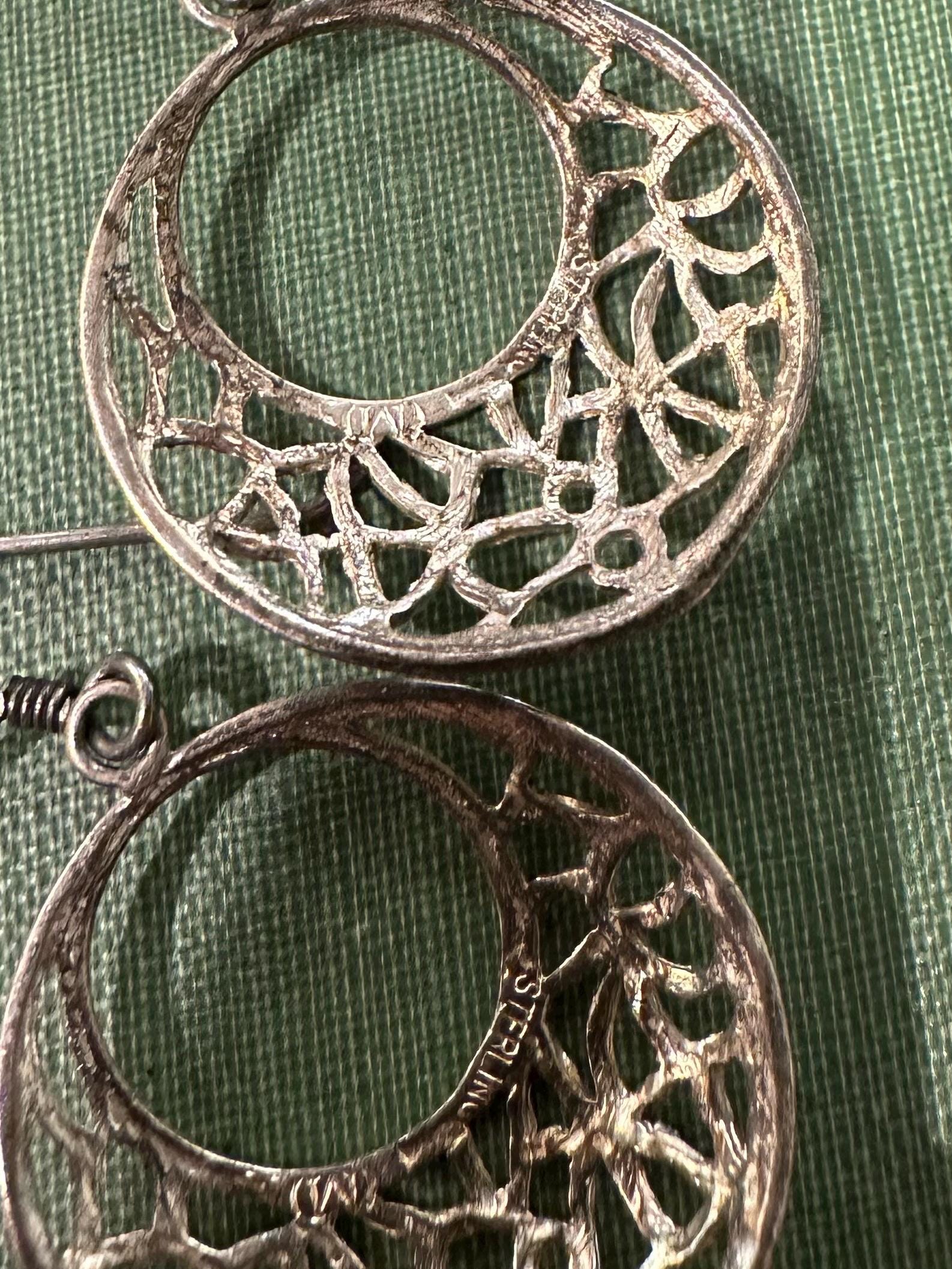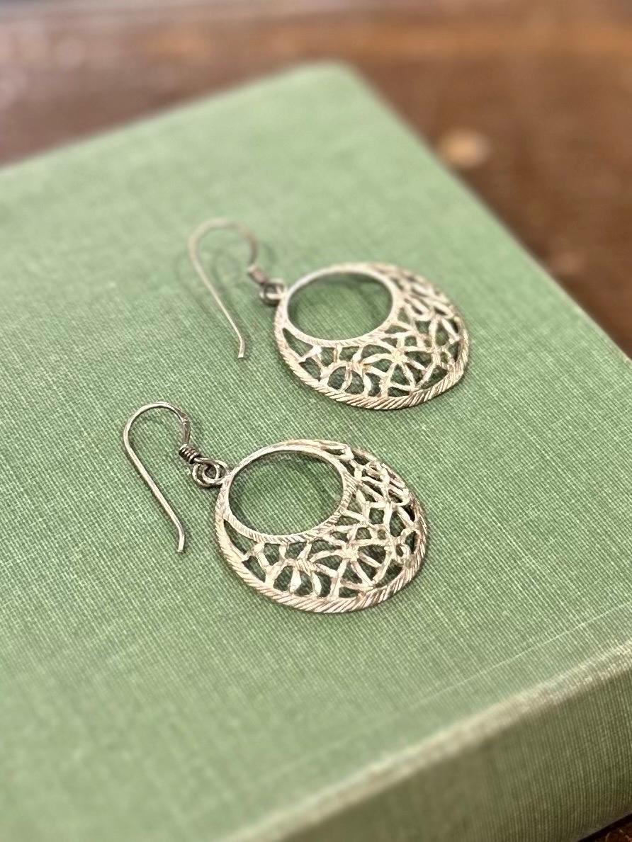 Vintage Sterling Silver 925 Open Circle Ornate Etched Dangle Earrings