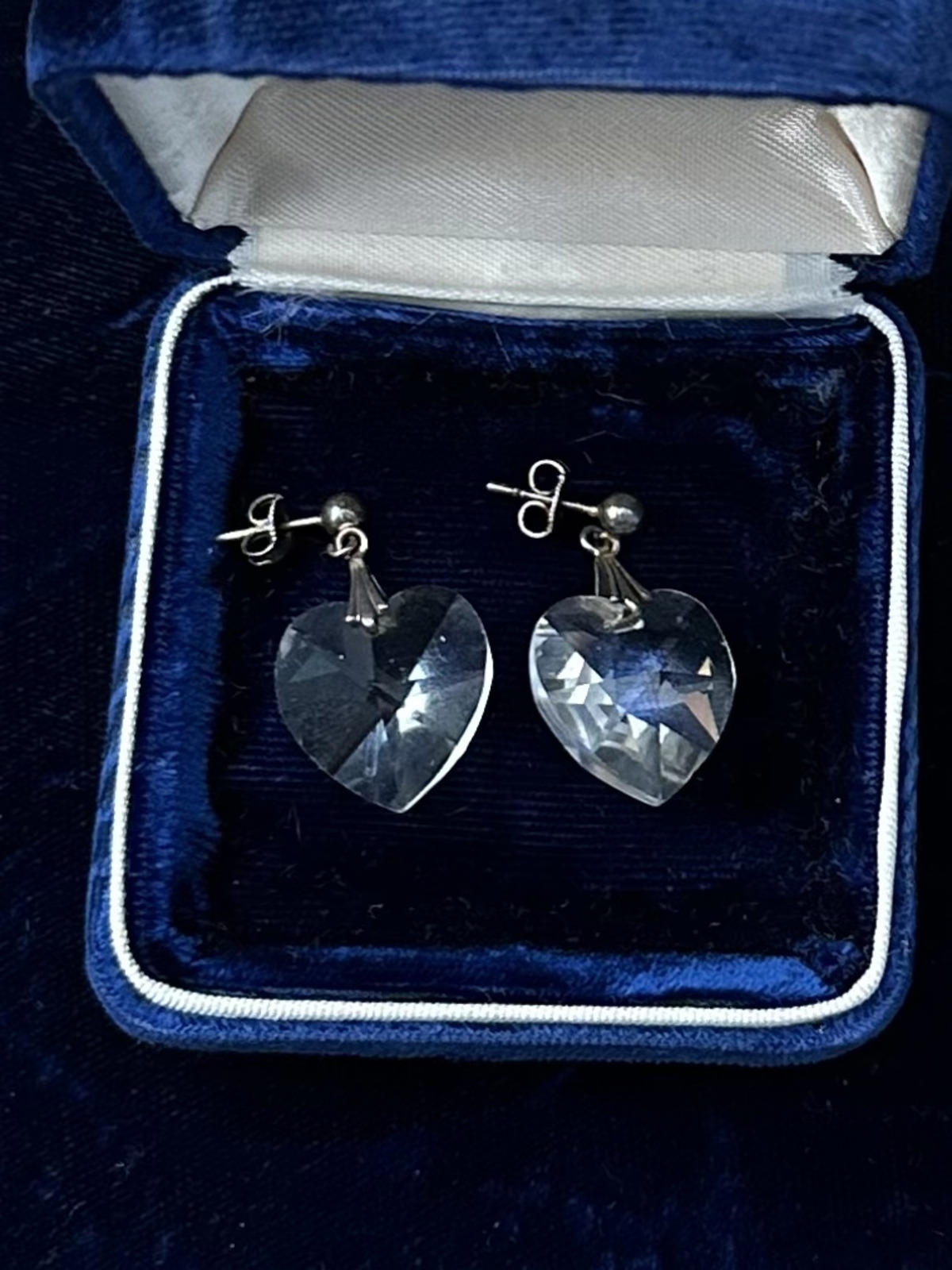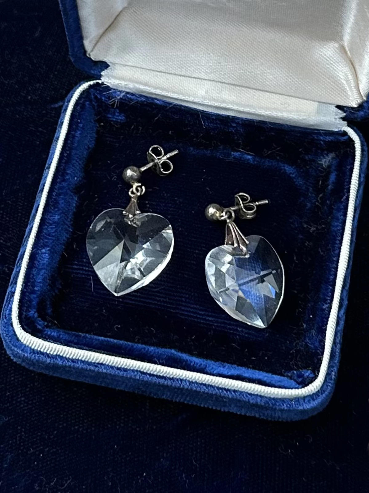 Vintage Midcentury Sterling Silver & Clear Cut Glass Heart Pierced Dangle Earrings