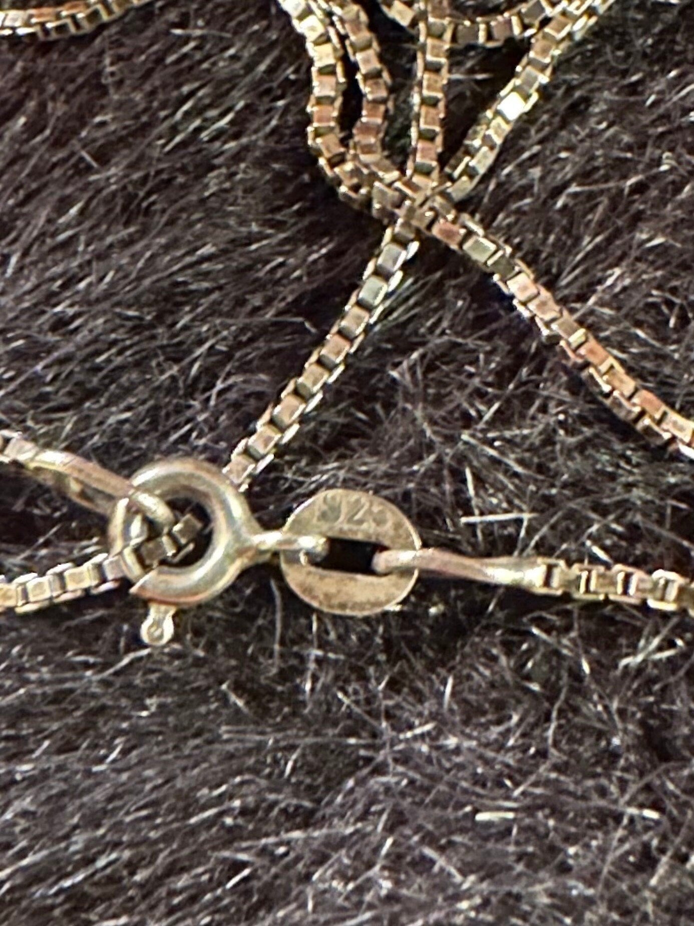 Chain measures approximately 23.5 inches long and has a spring ring clasp. Pendant measures approximately 1.1 inch wide by 1 inch tall.