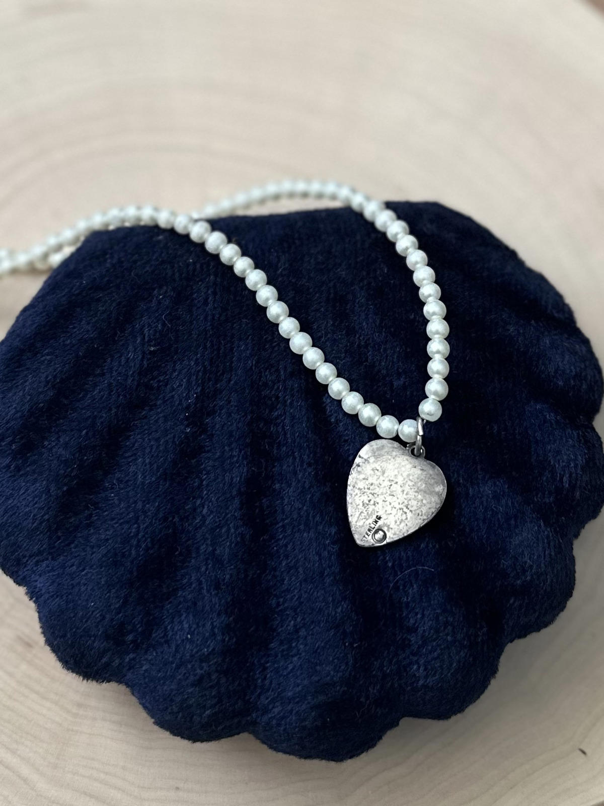 Beautiful repousse style floral and scroll motif sterling silver heart pendant strung on a faux pearl necklace, with a sterling silver toggle hook closure.