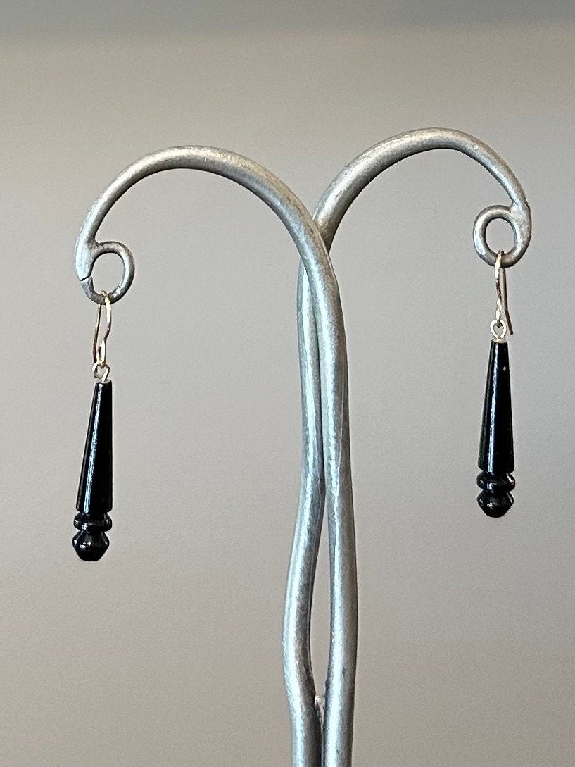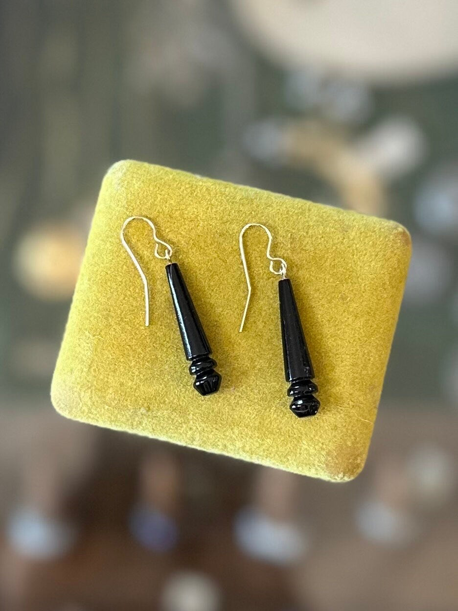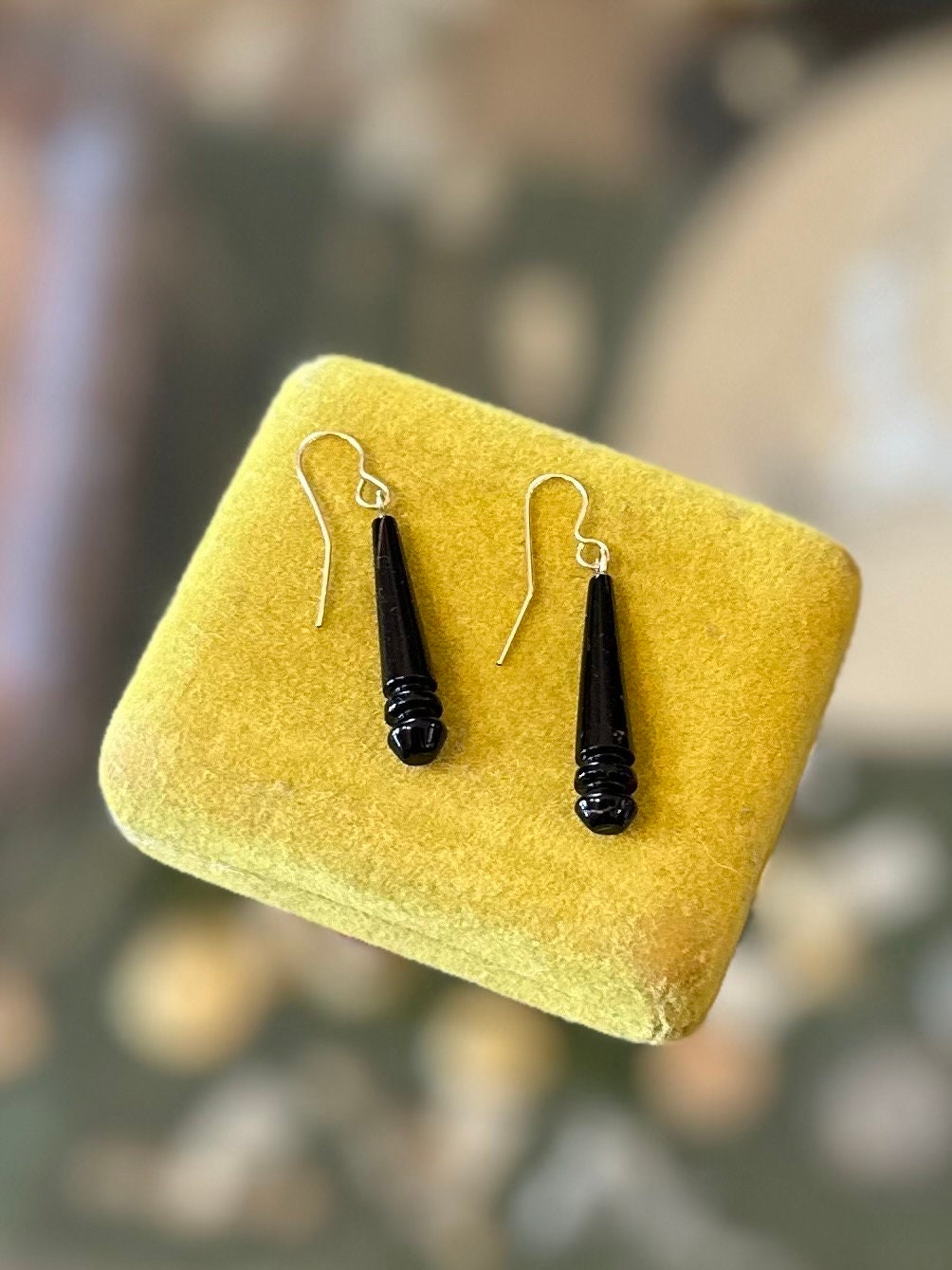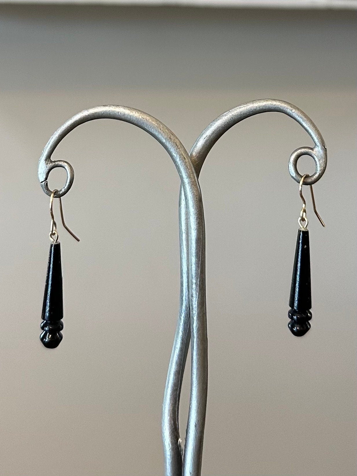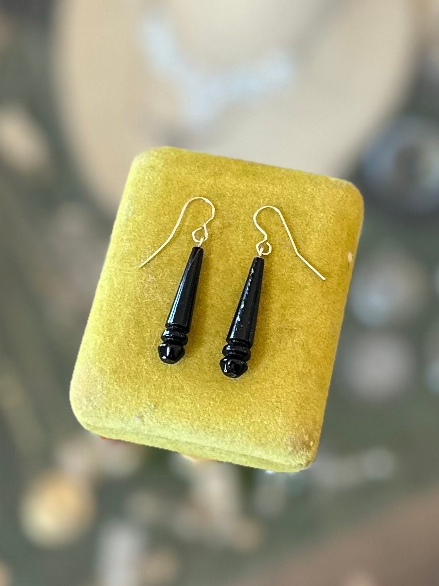 Sophisticated yet simple black lacquered & carved wood teardrop dangles on gold filled ear wire. Almost reminiscent of Victorian mourning jewelry!