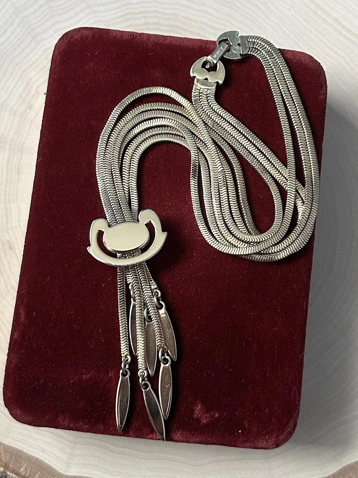 1950s Signed MONET Gold Tone Priscilla Slide Tassel Necklace Monogrammed JB 16"