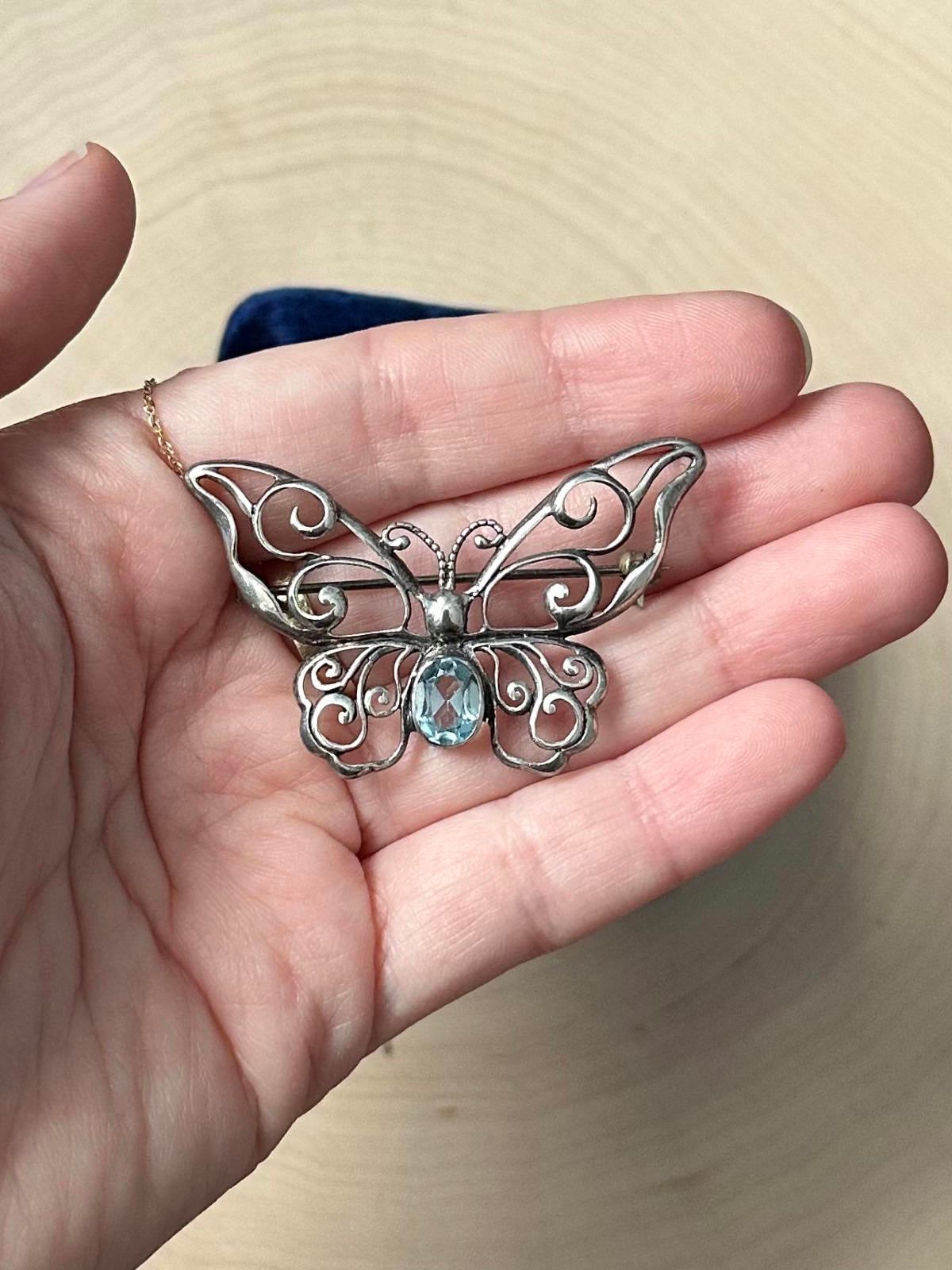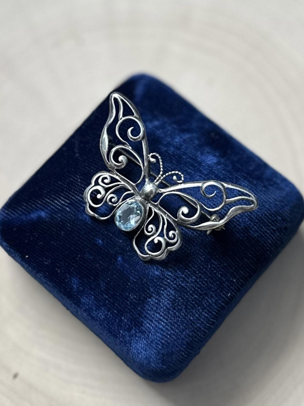1990s Signed MWS Mark Wasserman Samara Sterling Silver Blue Glass Butterfly Brooch